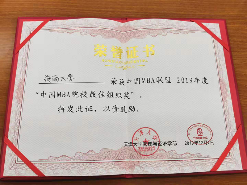 海南大学荣获“2019中国MBA院校最佳组织奖”