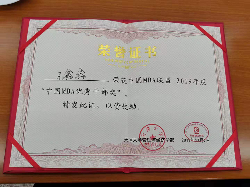 海南大学2018级MBA王鑫鑫获“2019中国MBA优秀干部奖”