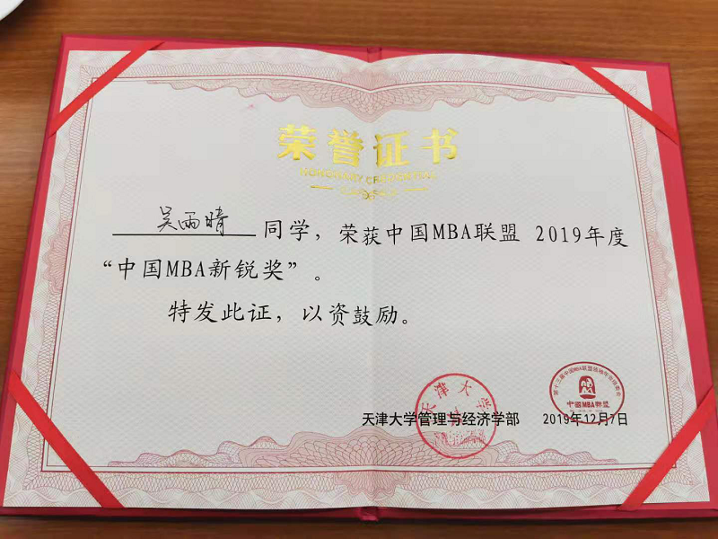 海南大学2018级MBA吴雨晴获“2019中国MBA新锐100奖”