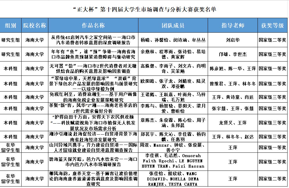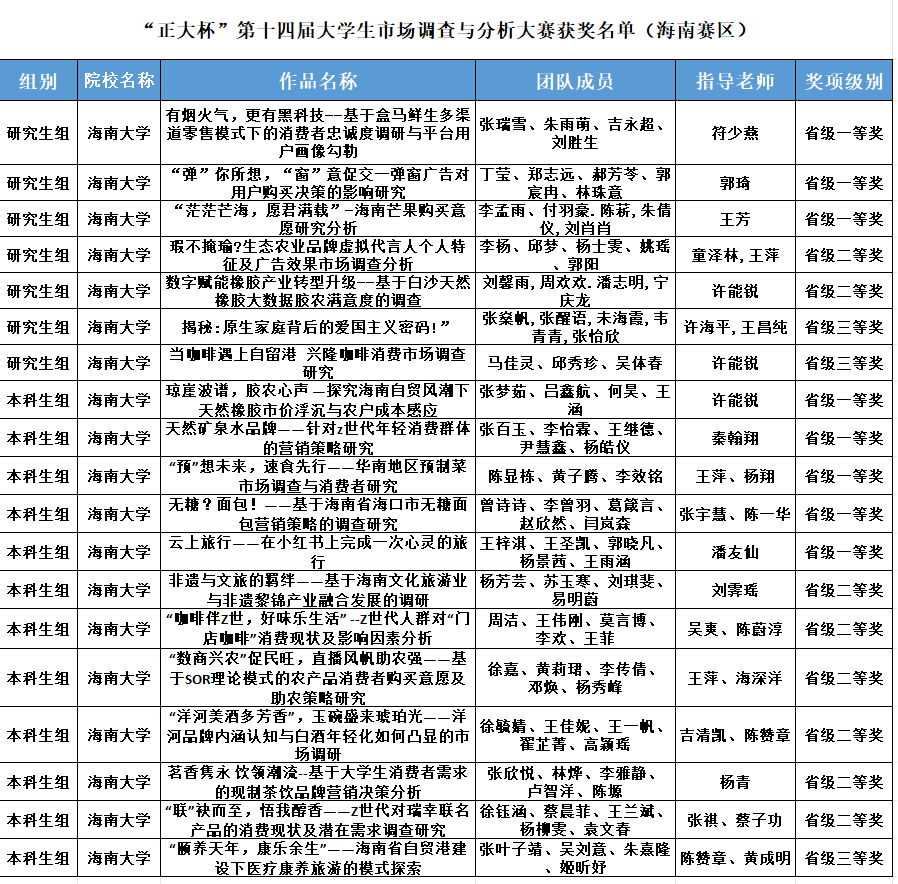 “正大杯”第十四届全国大学生市场调查与分析大赛于6月2日揭晓,海南大学国际商学院荣获多个奖项,其中,研究生组获国家级二等奖1项,三等奖1项,海南赛区一等奖3项,二等奖2项,三等奖2项;本科生组获国家级一等奖2项,二等奖1项,三等奖4项,海南赛区一等奖5项,二等奖6项,三等奖1项;在华留学生组国家级一等奖1项,二等奖2项的优秀成绩。