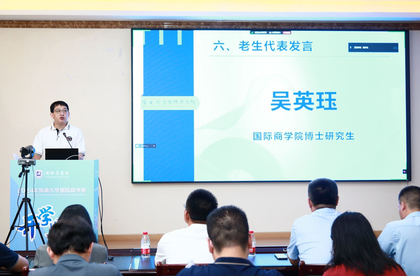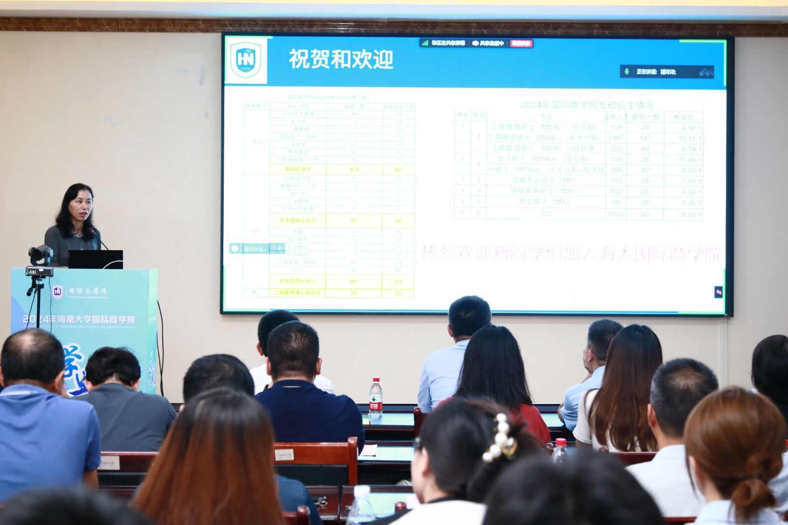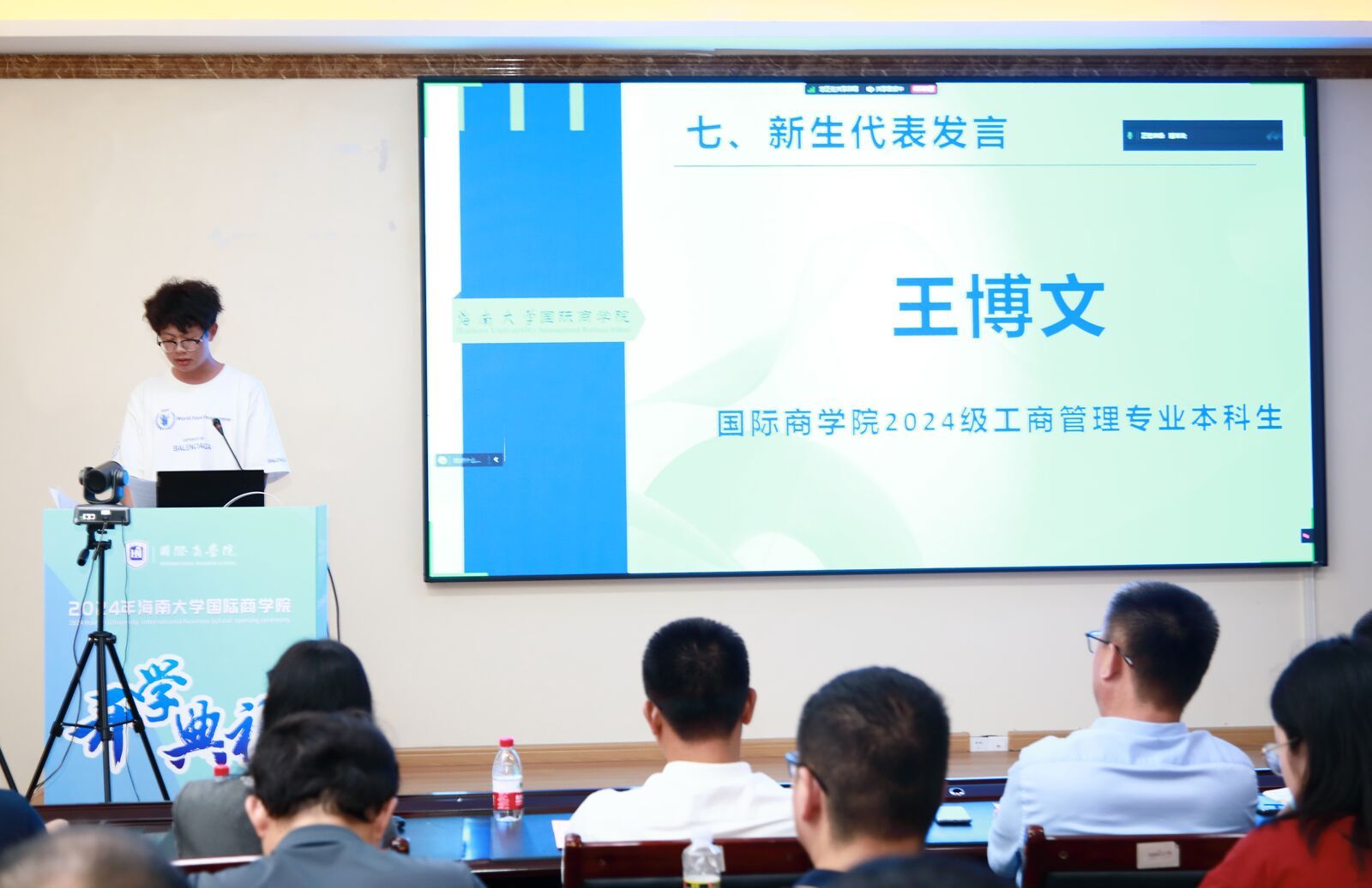 高佃恭副校长代表学校向国际商学院2024级新生们的到来表示热烈的欢迎与衷心的祝贺,介绍了学校发展现状并对学生们提出殷切希望。一是希望同学们珍惜时光,勤奋学习。超强台风“摩羯”给海南造成了重大损失,面对台风“摩羯”带来停水停电等重大挑战,省委省政府优先保障学校恢复供水供电,在具备条件的前提下抓紧复课复学。同学们要珍惜来之不易的学习机会,做到“三不一要”,即在求知求学的道路上奋发图强,不要沉迷于游戏,明确游戏与学习、生活的关系,努力学习专业知识,积极参与各类课外活动,丰富大学生活;遵守课堂纪律,按时上下课,不迟到早退;养成良好的生活习惯,坚持晨读晨练,不睡懒觉;要对得起自己的良知,勤奋学习,自律自强。二是希望国际商学院全体师生齐心协力,争先创优,共同打造国际商学院的金字招牌,未来几年在提升学生的升学率、增加赛事的“中奖率”、提高学位论文的优秀率等方面下功夫。三是希望同学们为建设世界一流自贸港而学习。在大学期间有明确的目标,刻苦学习,勤奋钻研,立志做有理想、敢担当、能吃苦、肯奋斗的新时代好青年,毕业后为建设世界一流自由贸易港做贡献。他鼓励本科生学出优秀,成为优秀的新时代大学生;鼓励研究生学出成效,积极思考国民经济和社会发展面临的关键难题、自贸港建设中存在的堵点卡点,从中提炼关键科学问题作为学术论文的研究内容,尤其是关注自贸港建设中体制机制、政策研究等关键核心问题;鼓励所有学生要学出精神,成为海大精神的新示范,将所学知识转化为推动自由贸易港发展的实际力量,为海南这片热土贡献自己的青春与智慧。
