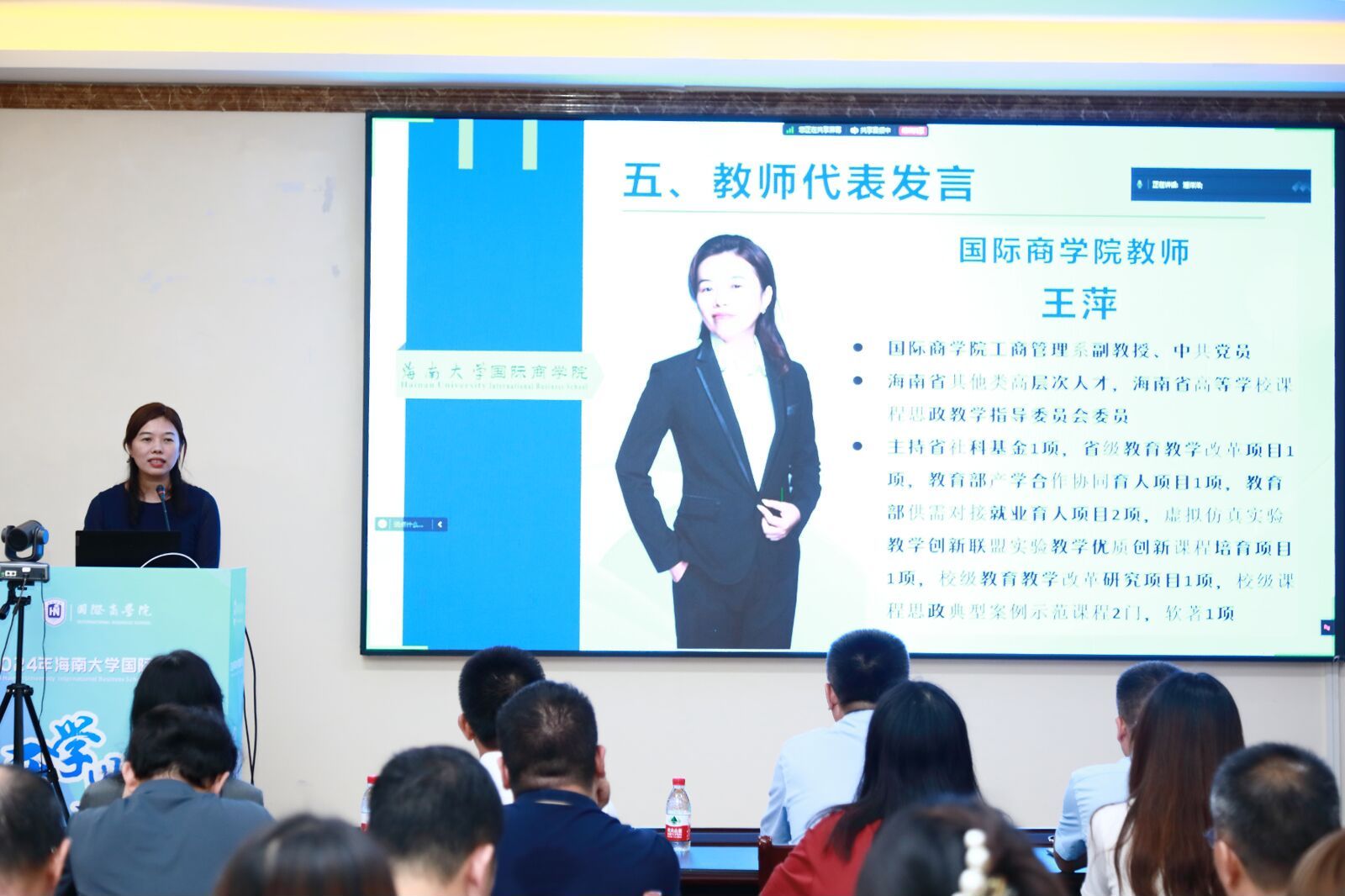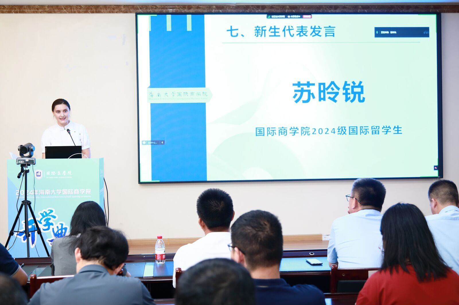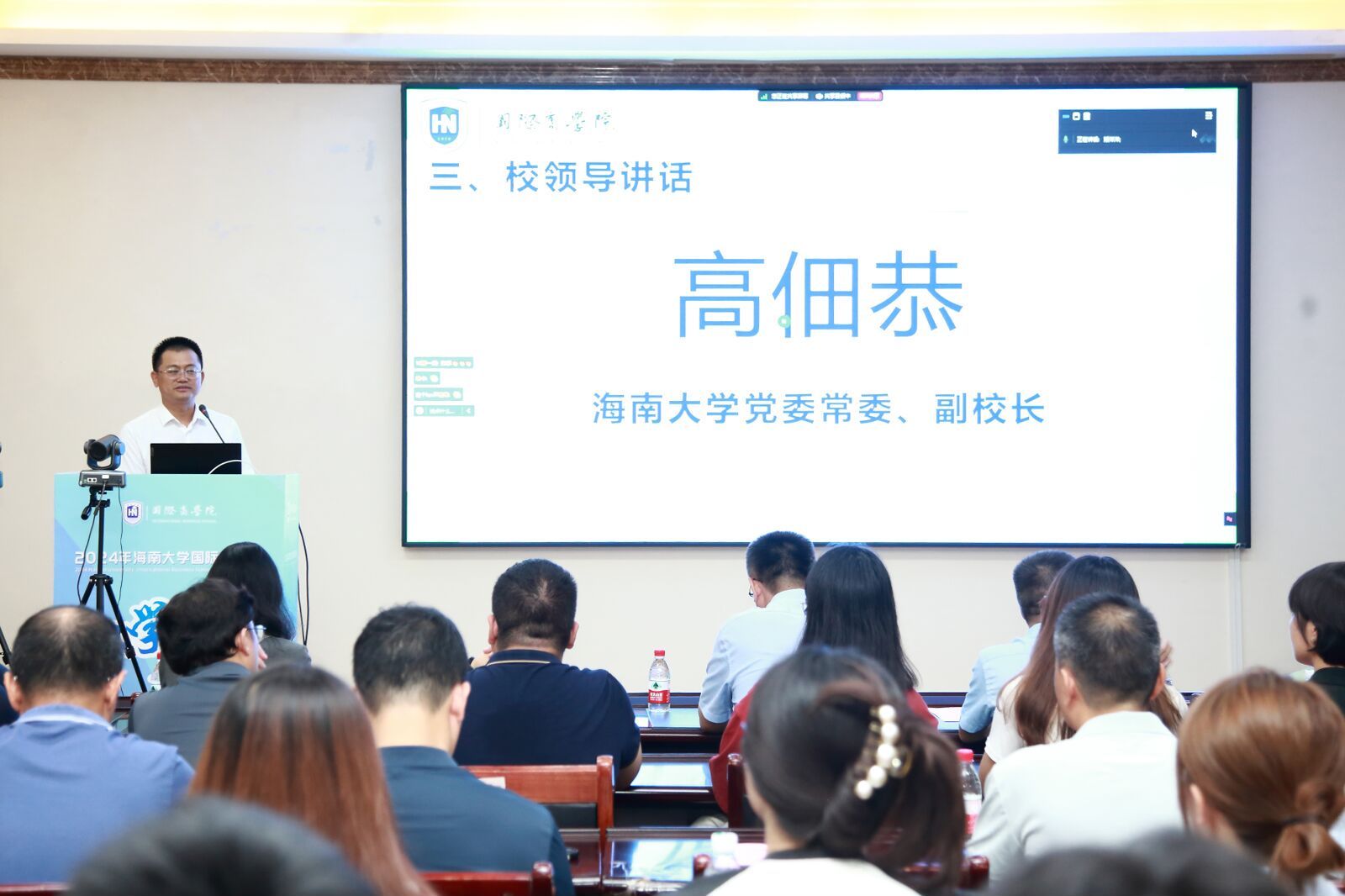高佃恭副校长代表学校向国际商学院2024级新生们的到来表示热烈的欢迎与衷心的祝贺,介绍了学校发展现状并对学生们提出殷切希望。一是希望同学们珍惜时光,勤奋学习。超强台风“摩羯”给海南造成了重大损失,面对台风“摩羯”带来停水停电等重大挑战,省委省政府优先保障学校恢复供水供电,在具备条件的前提下抓紧复课复学。同学们要珍惜来之不易的学习机会,做到“三不一要”,即在求知求学的道路上奋发图强,不要沉迷于游戏,明确游戏与学习、生活的关系,努力学习专业知识,积极参与各类课外活动,丰富大学生活;遵守课堂纪律,按时上下课,不迟到早退;养成良好的生活习惯,坚持晨读晨练,不睡懒觉;要对得起自己的良知,勤奋学习,自律自强。二是希望国际商学院全体师生齐心协力,争先创优,共同打造国际商学院的金字招牌,未来几年在提升学生的升学率、增加赛事的“中奖率”、提高学位论文的优秀率等方面下功夫。三是希望同学们为建设世界一流自贸港而学习。在大学期间有明确的目标,刻苦学习,勤奋钻研,立志做有理想、敢担当、能吃苦、肯奋斗的新时代好青年,毕业后为建设世界一流自由贸易港做贡献。他鼓励本科生学出优秀,成为优秀的新时代大学生;鼓励研究生学出成效,积极思考国民经济和社会发展面临的关键难题、自贸港建设中存在的堵点卡点,从中提炼关键科学问题作为学术论文的研究内容,尤其是关注自贸港建设中体制机制、政策研究等关键核心问题;鼓励所有学生要学出精神,成为海大精神的新示范,将所学知识转化为推动自由贸易港发展的实际力量,为海南这片热土贡献自己的青春与智慧。