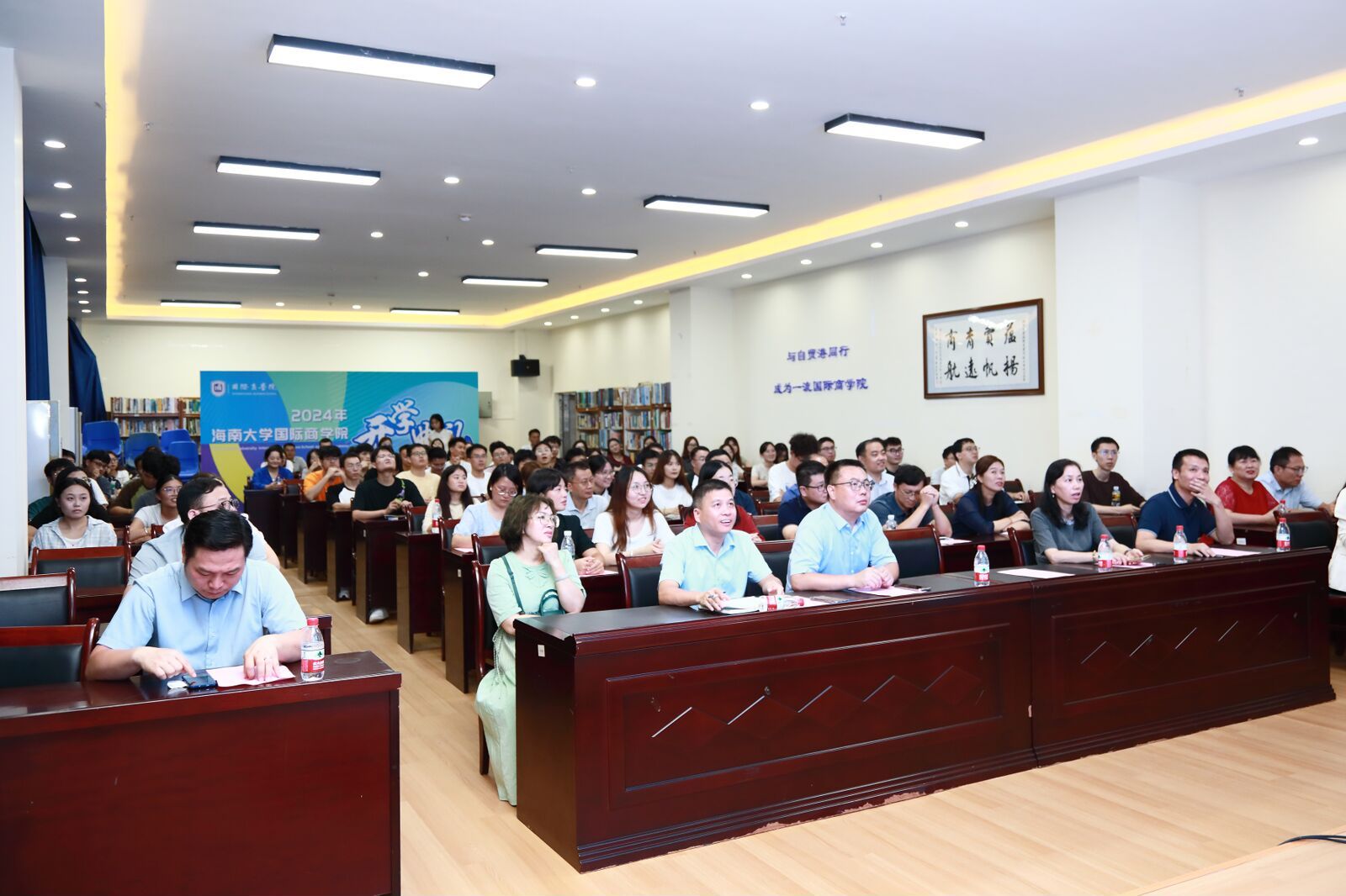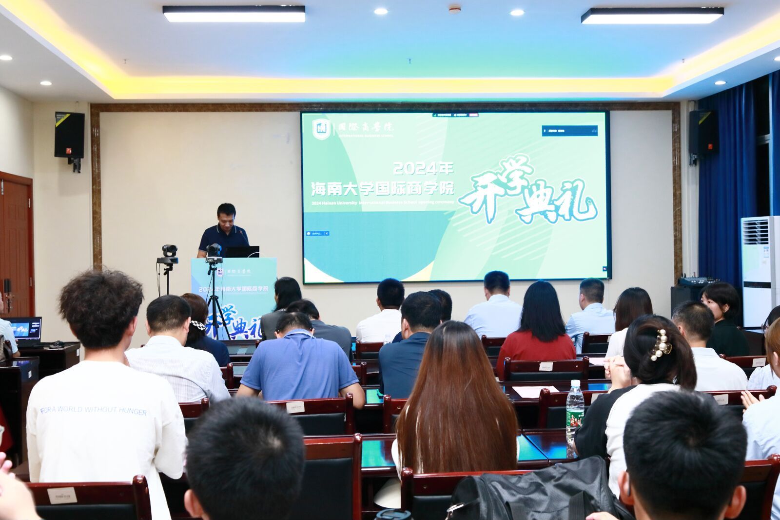 2024年9月13日晚上,国际商学院2024级新生开学典礼以“线上+线下”形式在社科楼B112学术报告厅举行。来自全国各地的597名本科生、436名硕士生、23名博士生以及37名国际留学生共聚一堂。海南大学党委常委、副校长高佃恭,国际商学院院长唐宁玉,院党委负责人,副院长许能锐、赵达、童泽林,院党委副书记、纪委书记(兼)王静出席典礼。典礼由副院长赵达主持。