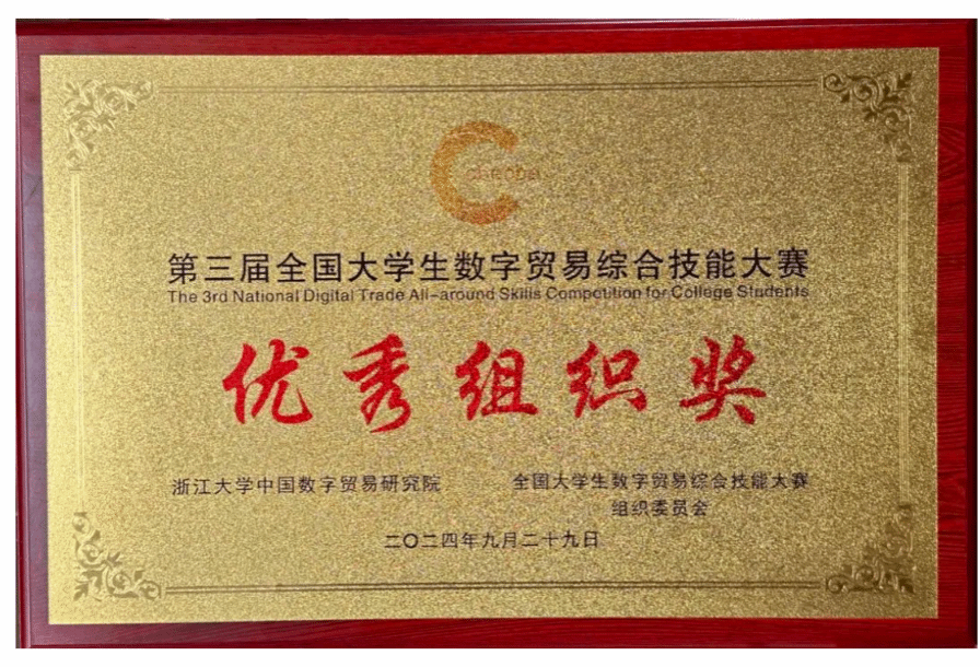 2024年9月28日至29日,第三届全国大学生数字贸易综合技能大赛全国总决赛暨颁奖典礼于浙江杭州举行。伟德bv1946官网参赛队伍获全国总决赛一等奖1项、二等奖1项、优秀指导老师奖1项,海南大学获优秀组织奖。此外,我院其他队伍在此前区域赛(华南赛区)中获二等奖2项、三等奖1项。