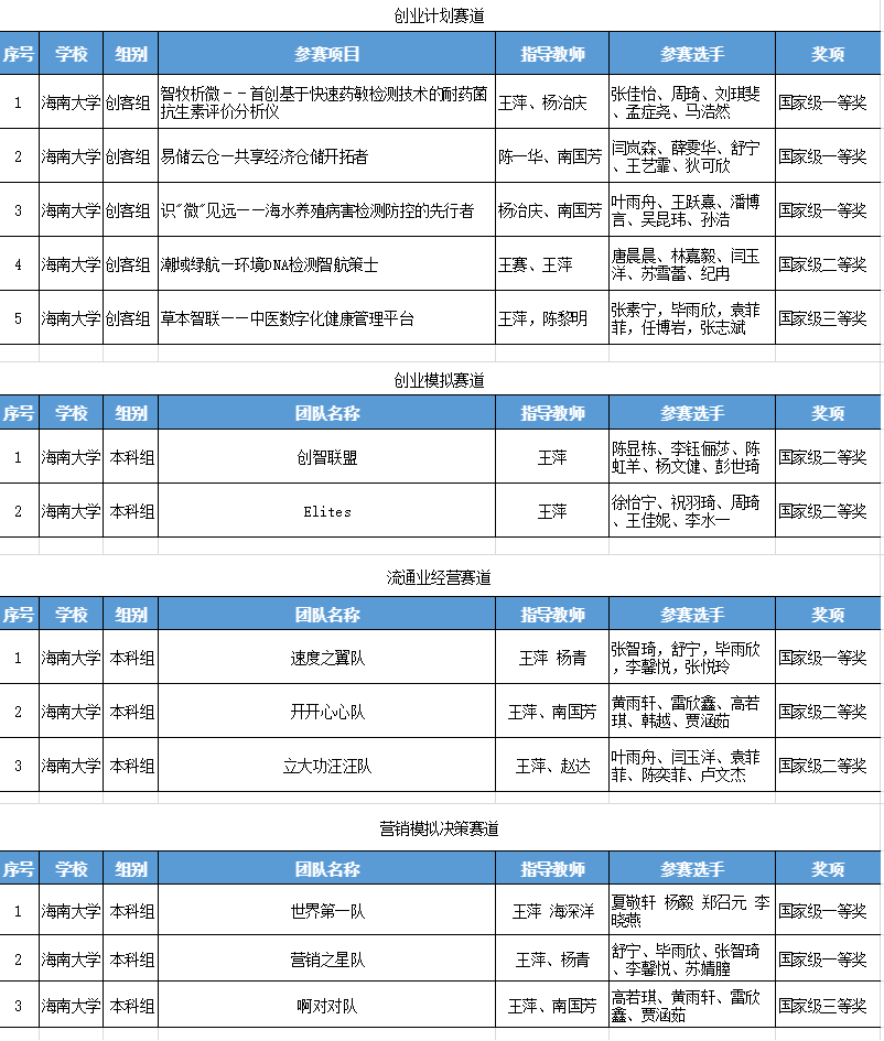 竞赛分为创业计划、创业模拟,流通业经营模拟、营销模拟决策四个赛道。在创业计划赛道,国际商学院获国家级一等奖3项,国家级二等奖1项,国家级三等奖1项;在创业模拟赛道,国际商学院获国家级二等奖2项;在流通业经营赛道,国际商学院获得国级一等奖1项,二等奖2项;在营销模拟决策赛道,国际商学院获得国家级一等奖2项,三等奖1项。