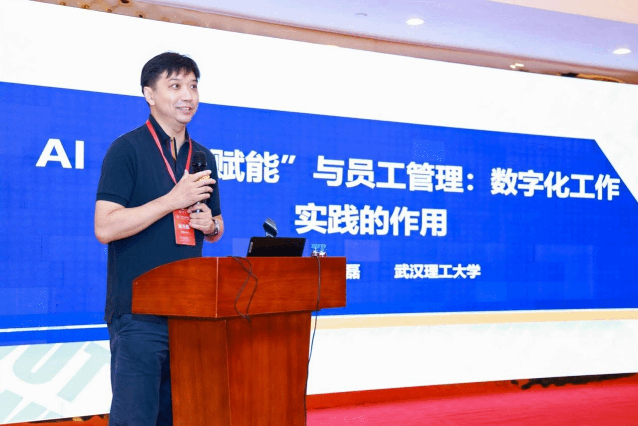 武汉理工大学管理学院张光磊教授以“AI‘双向赋能’与员工管理:数字化工作实践的作用”为主题进行了报告。张光磊教授围绕承担的国家自然科学基金重点课题深入阐述了立项背景及核心问题,分享了五个子课题的研究内容。