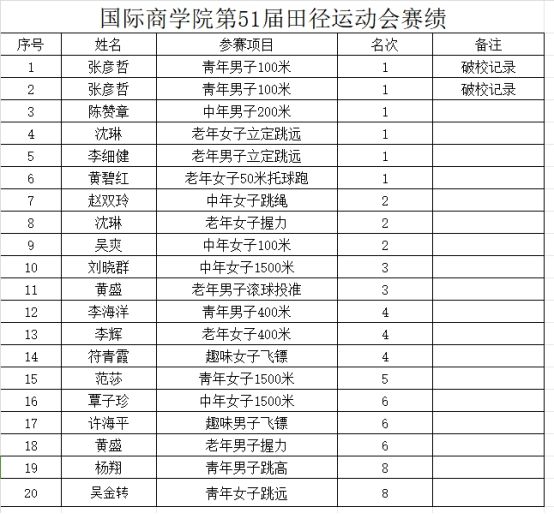 体育盛事展英姿,接力赛中,我院运动健儿用速度诠释着激情与梦想,每一次拼劲全力的冲刺,都是对团队荣誉的捍卫。由张彦哲、李海洋、陈赞章、刘国伟老师组成的男子教工代表队勇夺4*100m项目冠军;由吴爽、覃子珍、李龙梅、范莎老师组成的女子教工代表队荣获4*400m项目第八名。