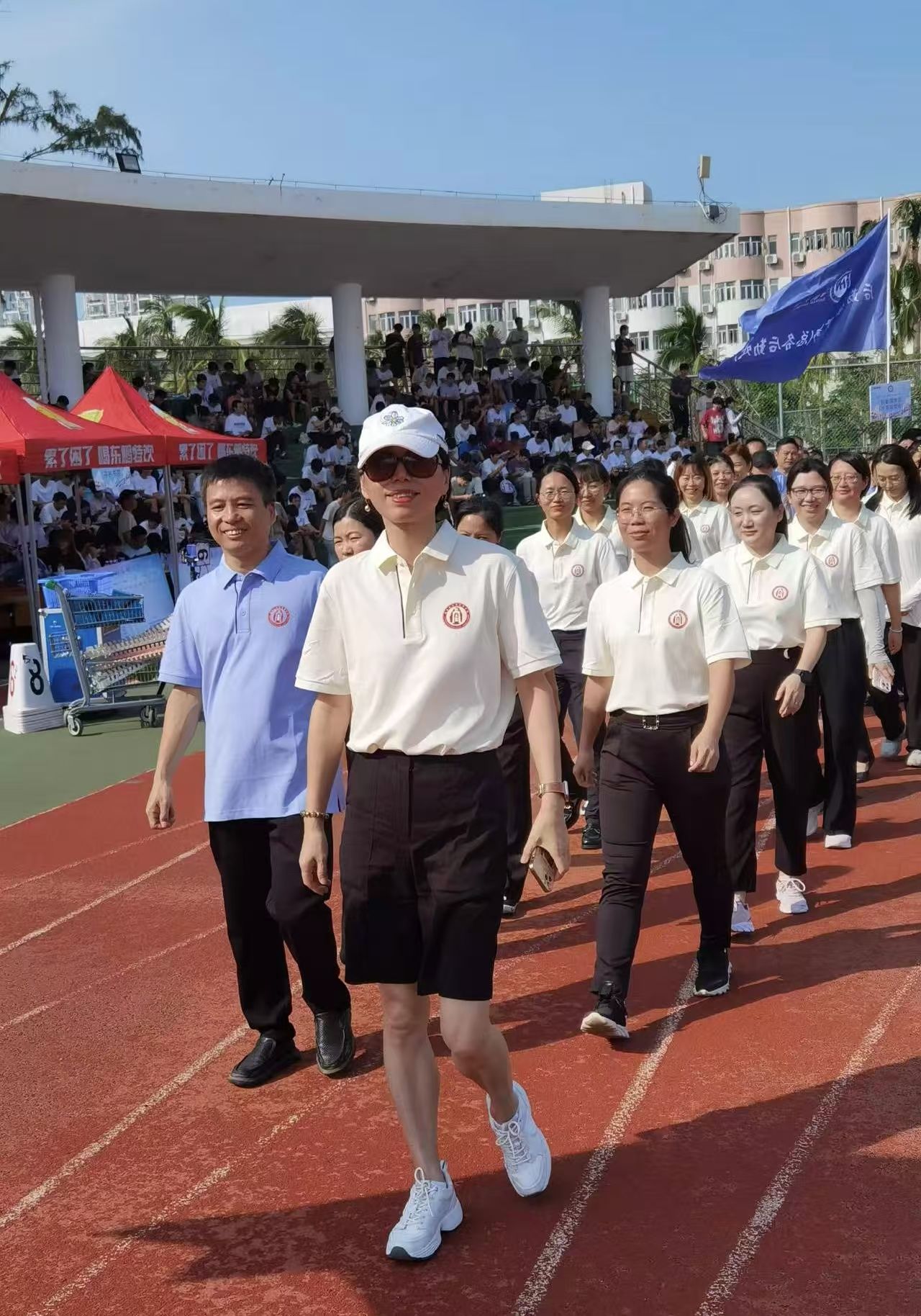 开幕式上,红色院旗在阳光下焕发生机,我院教职工方阵身着白色和蓝色的运动服入场,步伐一致,气质昂扬,高喊“道器并举,商济天下”的口号,以坚定的步伐和灿烂的笑容展现出国际商学院积极向上的精神风貌。