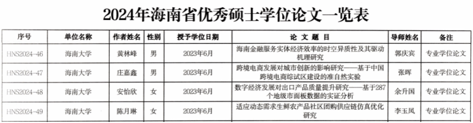 经评选,我院2023届金融硕士黄林峰(导师:郭庆宾教授)、国际商务硕士庄嘉鑫(导师:张晖教授)、国际商务硕士安怡欣(导师:余升国副教授)、农业硕士陈月琳(导师:李玉凤教授)的学位论文获评2024年海南省优秀硕士学位论文。