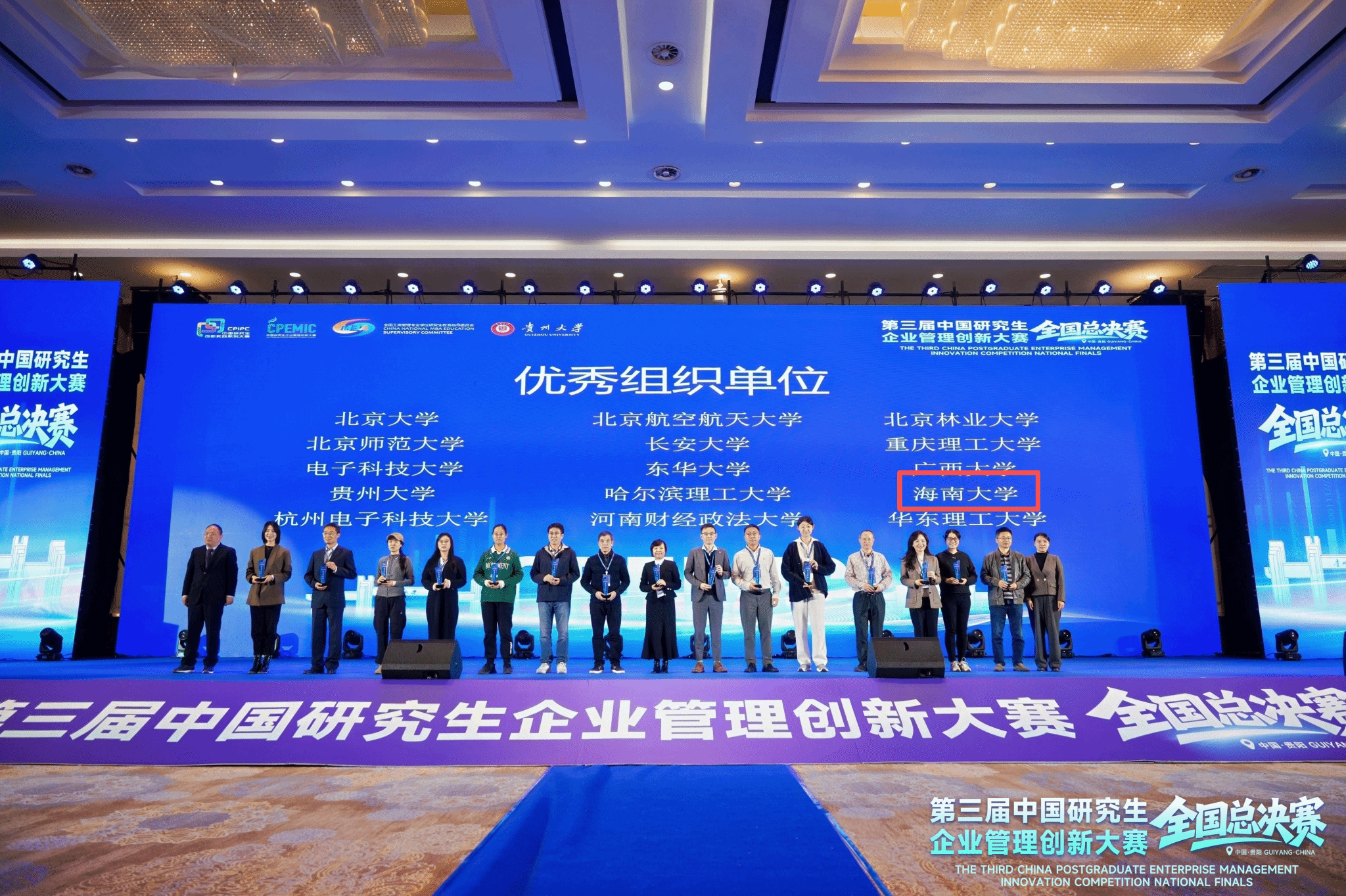 2025年11月8日,第三届中国研究生企业管理创新大赛总决赛于贵州大学顺利结束。海南大学凭借出色的组织能力,荣获优秀组织奖,与北京大学、哈尔滨理工大学、电子科技大学等知名高校共同获此殊荣。海南大学MBA“三思智行队”,成功突围进入总决赛。