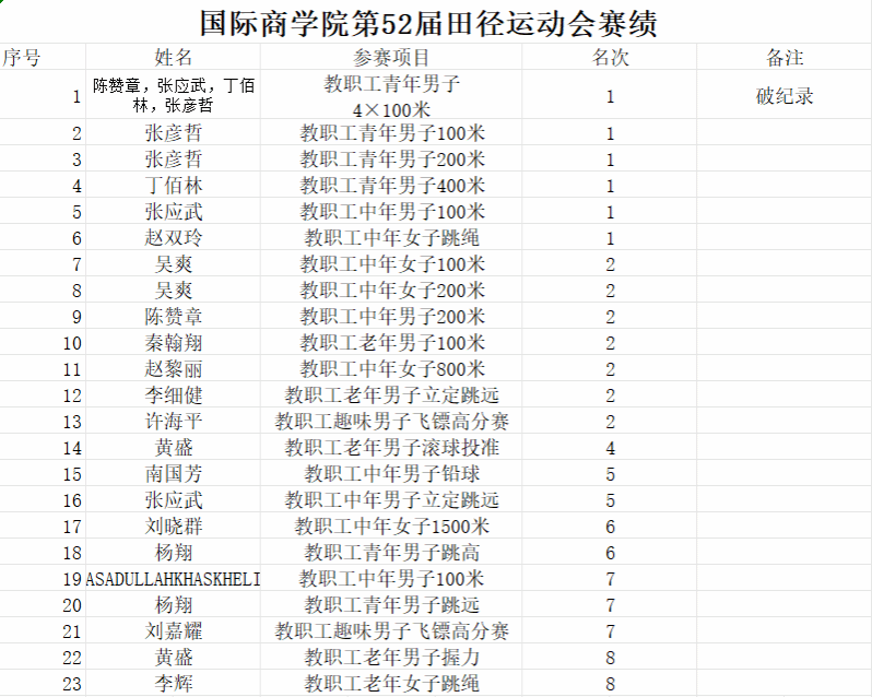 此外,学院在其他项目中亦有优异表现,多位教职工在跳远、铅球、中长跑等项目中也取得了前八名的好成绩,充分展现了国际商学院教职工全面发展的体育素养和顽强拼搏的团队精神。