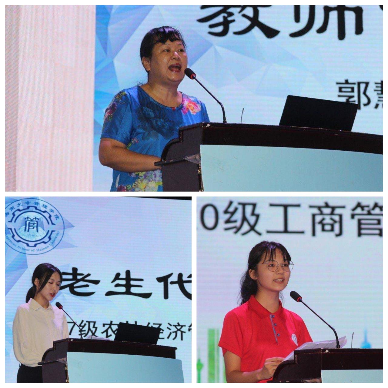教师代表郭慧芳,在校生代表宋词,新生代表何姝健分别发言,对同学们的大学生活提出期望,作出承诺,并希望同学们能够在海南自贸港的背景下,开启全新精彩的大学生活。