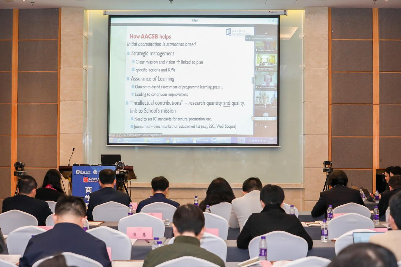 第二场主题报告由海南大学管理学院院长唐宁玉教授主持。暨南大学管理学院院长黎文靖教授作“新形势下商学院发展的挑战、机遇和对策”主题演讲。广西民族大学管理学院院长马璐教授发表“RECP背景下区域管理学院的国际化趋势与应对”主题演讲。会议还邀请到香港浸会大学管理学院院长Ed Snape 教授,他发表的演讲题目是“Developing the Business School:The Role of International Accreditations”。澳门城市大学商学院院长Jose Alves 教授通过在线视频发表“The Network-Based Business School: Why it is growing and how it will change business education”主题演讲,香港中文大学商学院院长周林教授在线作“香港高校商学院和国内院校合作的前景”主题演讲。