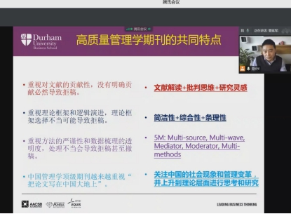 2020年12月4日,英国杜伦大学商学院管延军教授讲授的课程“学术论文写作:从研究设计到论文写作与发表”(24学时)在网络上开讲,这是学校资助我院的5个“外国科研专家与授课项目”之一。此次课程开讲伊始就有200多名硕/博士研究生和年轻教师报名,为提升课程的教学质量,照顾到老师和同学们的现实需求,并解决大家在文献综述、研究设计及论文发表等方面的具体问题,课程最终筛选了60名学员为核心听课成员,全程参与小组作业和互动讨论,其余学员为旁听成员。