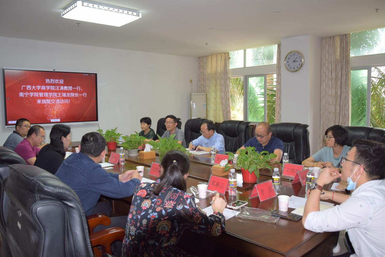 2021年3月26日下午,广西大学商学院汪涛教授一行、南宁学院管理学院王瑞龙院长、曹会兵副院长一行来我院交流访问。海南大学管理学院唐宁玉院长、张德生副院长出席会议。