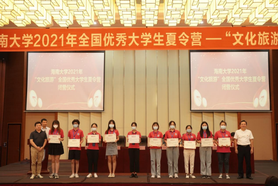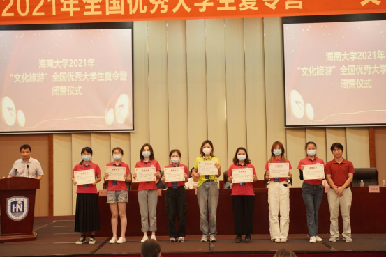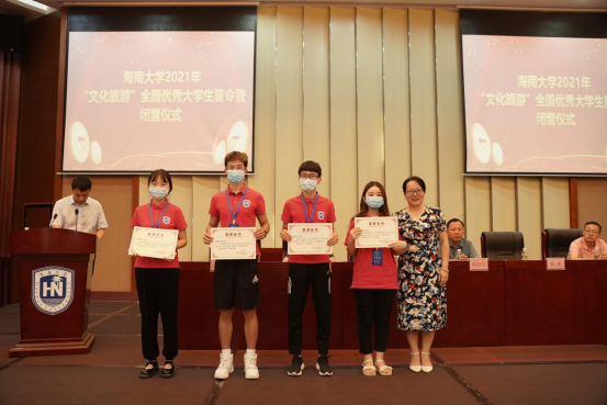 各学院领导分别为本学院获得“优秀营员”称号的同学颁奖。管理学院邢谷川书记、旅游学院韩力光书记分别致辞,对获奖的同学表示祝贺,希望能在最美的九月与大家再次相见。优秀营员代表郑佳敏在发言中表达了同学们对学校周到安排的感谢,以及对进入海南大学深造的向往。