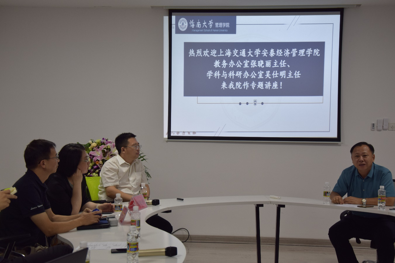 2021年7月12日上午,学院邀请上海交通大学安泰经济管理学院教务办公室张晓丽主任、学科与科研办公室吴仕明主任来我院作专题讲座,学院全体党政班子领导、各系主任及副主任、各办(中心、项目、实验室)全体工作人员参会,本次讲座由许能锐副院长主持。