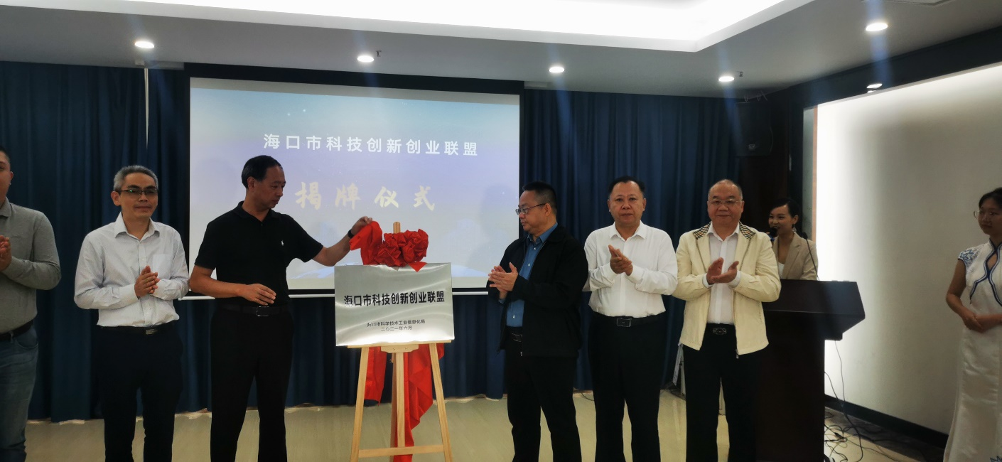 海口市科学技术工业信息化局副局长梁劲松,海南大学科技处处长邹勇华,海南大学管理学院党委书记邢谷川,海南大学教授、海南省创新创业研究院院长李伟铭,国家高新区孵化器副总经理吴亦田,海南自贸区阳光金鹿产业园运营管理有限公司副总经理陈锐为海口市科技创新创业联盟隆重揭牌。