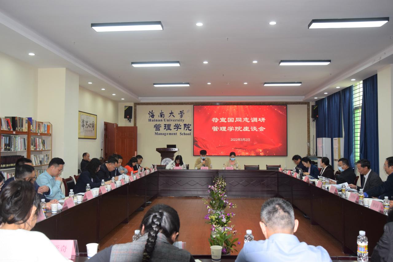2022年3月2日上午,校党委书记符宣国一行来我院调研指导工作并座谈交流。副校长傅国华,纪委书记、省监察委员会驻海南大学监察专员郑尉杰陪同调研,学校相关职能部门负责人参加。
