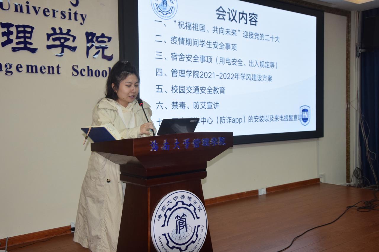 会议第一部分,为进一步落实学校安全教育工作,强化学院的安全管理,提高同学们的安全意识,肖亚奇进行安全主题教育,涵盖了四个主要内容,第一、强调了疫情期间学生安全事项,明确学校关于疫情防控政策,并要求学生按照政策进行在校活动。第二、进行宿舍安全教育,注重宿舍卫生,禁止使用违规电器,夜间按时返回宿舍。第三、要求同学们注意校园交通安全,骑电动车的同学要遵守交通规则和学校的电动车管理制度。第四、进行禁毒、防艾、防诈教育,提高安全意识和自我保护意识。最后,结合2022届毕业生考研和工作情况,对同学们进行学风建设教育,倡导同学们结合自身实际尽早进行自我规划和提高学习自主性。