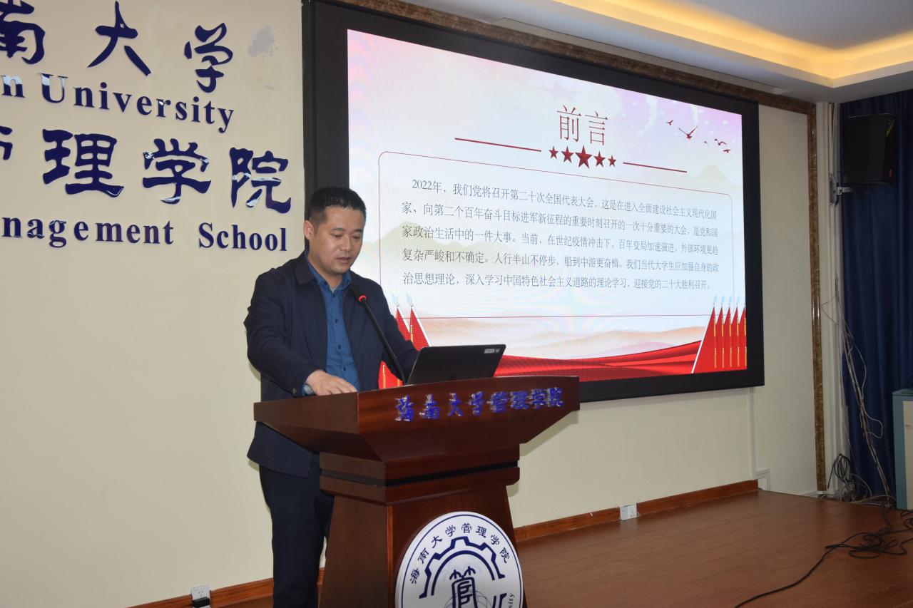 会议第二部分,为加强爱国主义教育,迎接、学习、宣传党的二十大,易振带领大家回顾了党的百年历史成就,引导学生加强政治理论学习,聚焦迎接宣传贯彻党的二十大这条工作主线。他说到,生逢伟大时代,党对我们要求是必须练好内功、提升修养,做到信念坚定、对党忠诚,注重实际、实事求是,勇于担当、善于作为,坚持原则、敢于斗争,严守规矩、不逾底线,勤学苦练、增强本领,努力成为可堪大用、能担重任的栋梁之才,不辜负党和人民期望和重托。作为新时代的大学生,要脚踏实地,实事求是,心中有梦想,脚下有方向,以高昂的学习态度和饱满的学习热情,将自身发展与海南大学的发展、海南自贸港的发展以及中华民族伟大复兴的事业相结合。