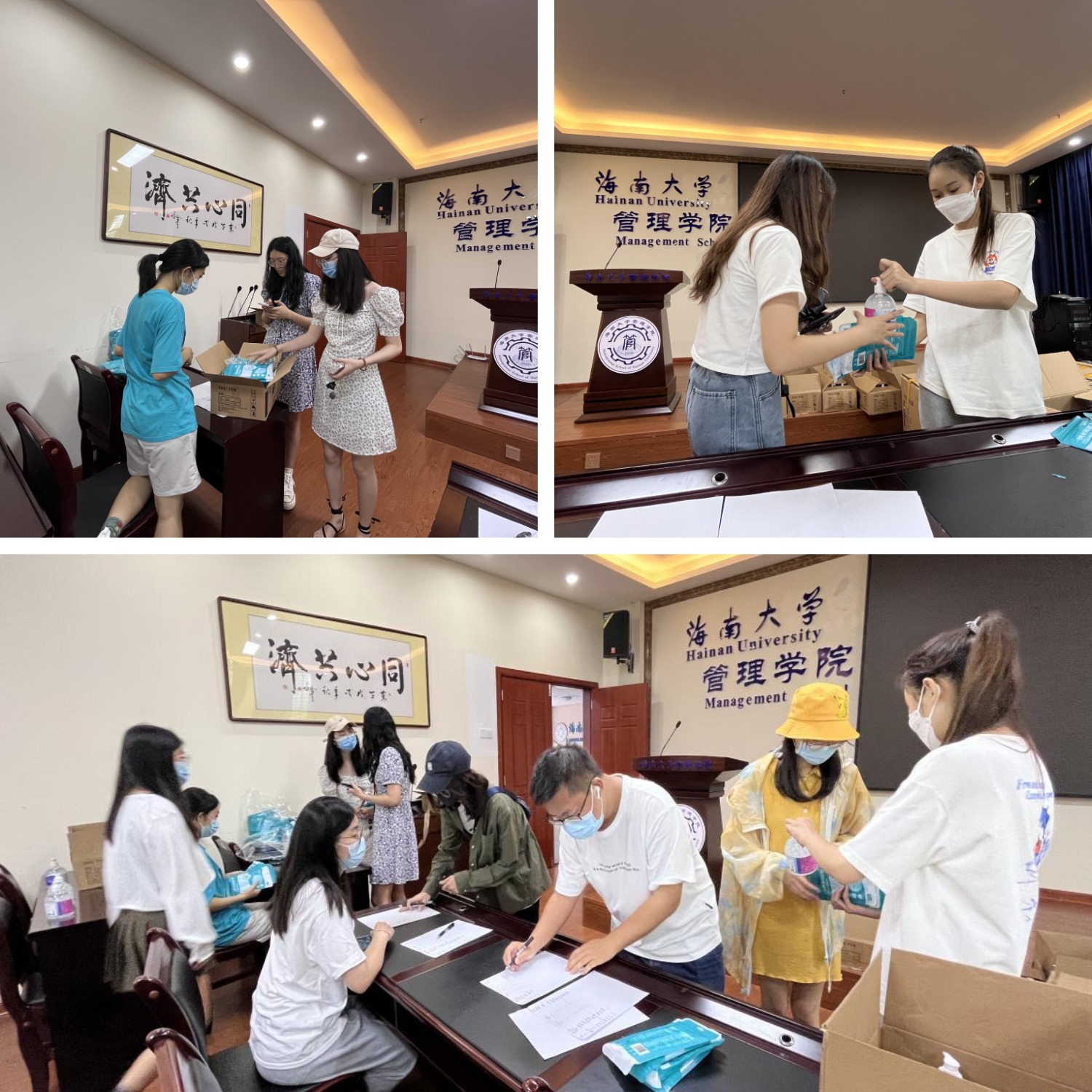 采购并发放防疫物资。学院启用专项资金为学生采购口罩、消毒液等防疫物资,发放到每个宿舍。
