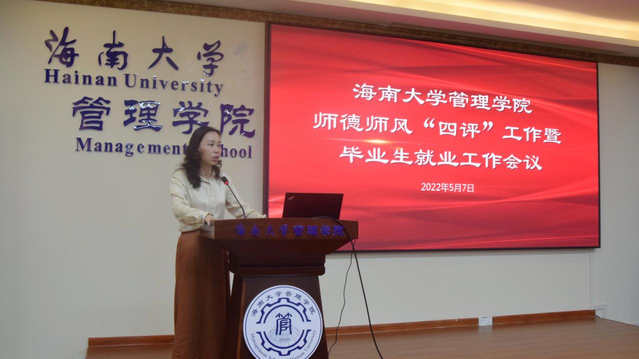 2022年5月7日下午,管理学院在社科楼B112学术报告厅召开师德师风“四评”工作暨毕业生就业工作会议。管理学院院长唐宁玉、党委书记邢谷川、副院长张德生、副院长付景涛以及天工书院党委副书记(主持工作)易振出席会议。各教工党支部书记、各系、办(中心/项目)主任及就业工作联系人参加会议。