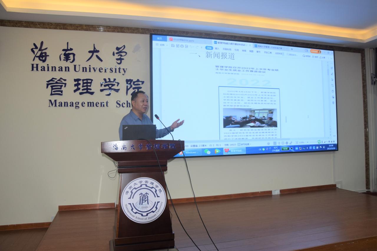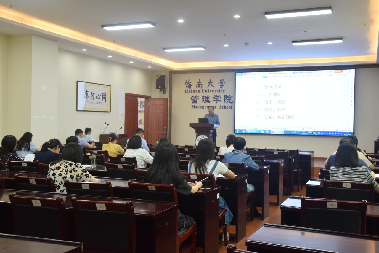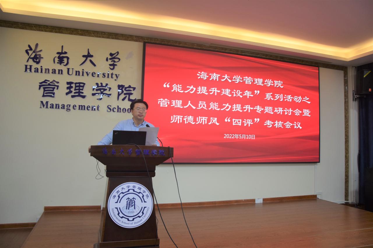 2022年5月10日下午,海南大学管理学院在社科楼B112学术报告厅举办“能力提升建设年”系列活动之管理人员能力提升专题研讨会暨师德师风“四评”考核会议。管理学院党委书记邢谷川,党委委员、副院长付景涛及全体综合管理人员出席会议。本次会议由学院党委委员、综合办公室主任刘扬雄主持。