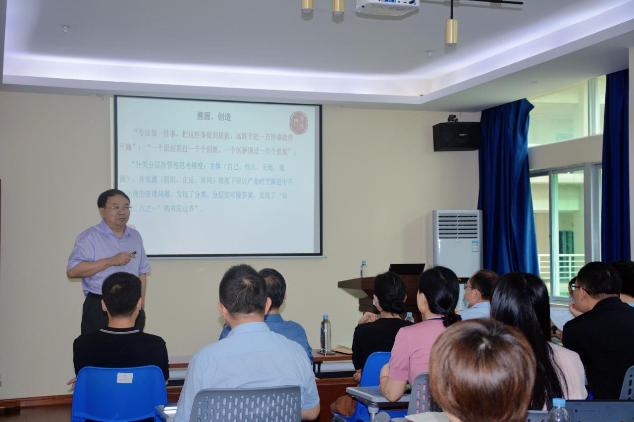 2022年5月10日下午,海南大学管理学院学术沙龙在社科楼B308开幕。学术沙龙第一讲由海南大学副校长傅国华教授担任主讲人,主题为“数业管理:分类分层次管理理论创新”。管理学院院长唐宁玉、党委书记邢谷川、党委副书记易振、党委委员\副院长张德生、党委委员\副院长付景涛、党委委员\副院长赵达、副院长童泽林,以及管理学院20余名师生参加本次学术沙龙。主持人由赵达担任。