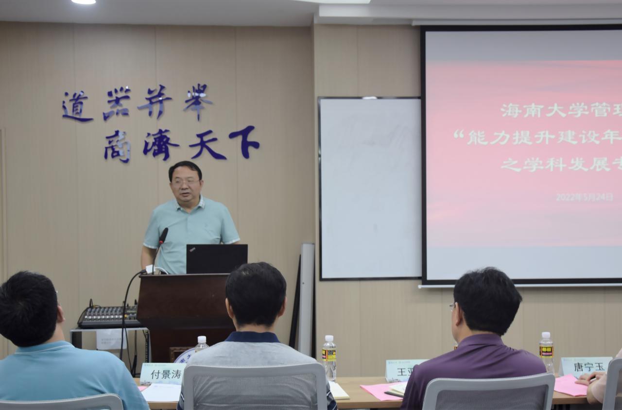 2022年5月24日下午,管理学院在社科楼B623室举办“能力提升建设年”系列活动之学科发展专题会。海南大学副校长傅国华、研究生处副处长于涛、人文社科处副处长王亚卓,管理学院全体院领导、学术委员会委员、各系主任及青年教师等出席会议。会议由管理学院党委委员、副院长赵达主持。