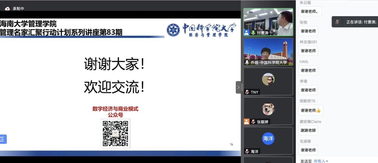 2022年5月25日19点30分,中国科学院大学经济与管理学院副院长乔晗教授应邀做了主题为《平台商业模式的新特点和新原理》的专题讲座。本次讲座通过腾讯会议采取线上线下同步进行的方式,海南大学管理学院部分老师和企业管理硕士研究生线下参加、部分校内外老师和研究生线上参加,共计有超过500人参加了讲座。海南大学管理学院院长唐宁玉教授代表学院致欢迎词,副院长付景涛教授主持讲座。