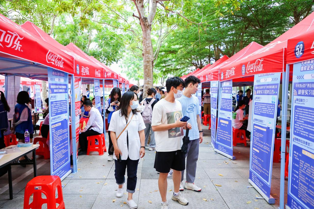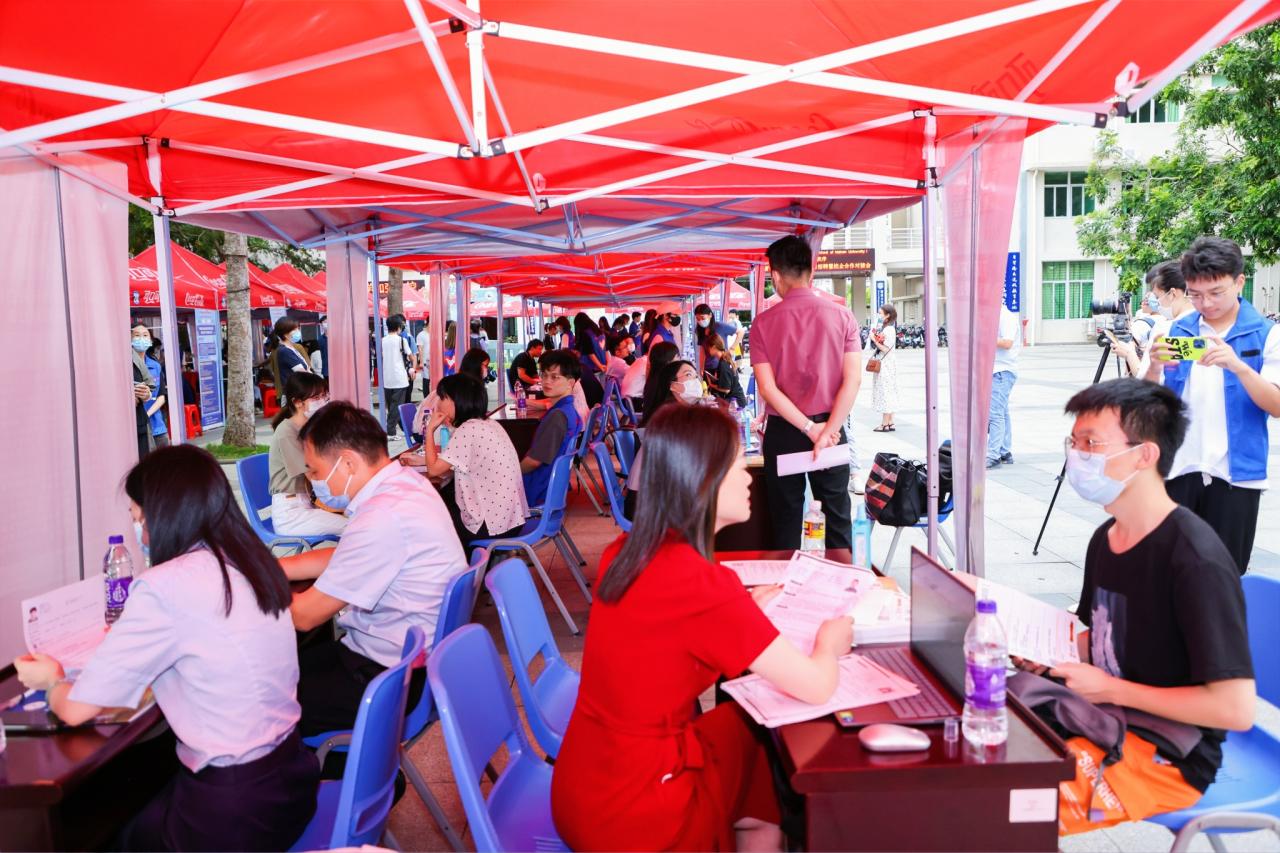 专场就业实习招聘会在社科楼广场举行。现场共有57家企事业单位参会,涉及金融、物流、科教、商贸、建筑、旅游、政法等多个领域,为学生提供了多元广阔的选择空间和机会。