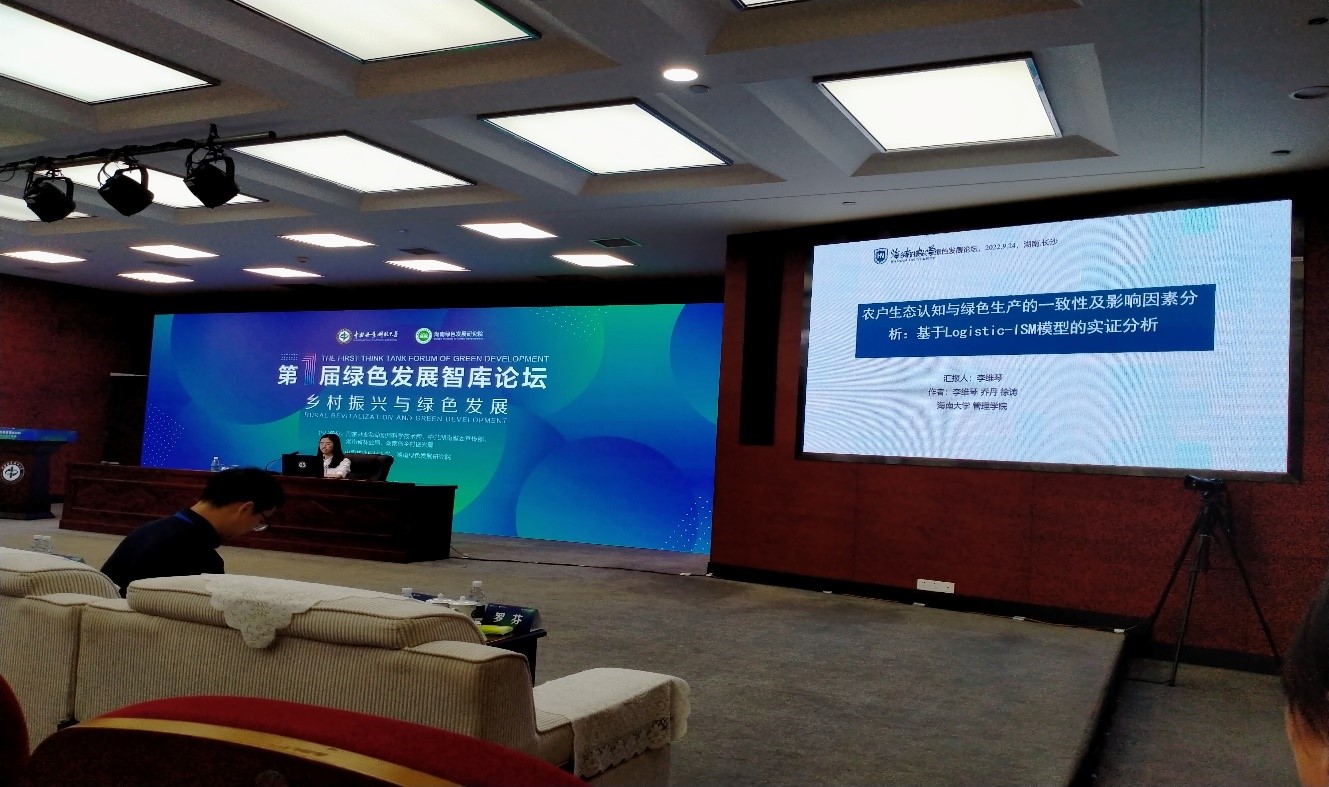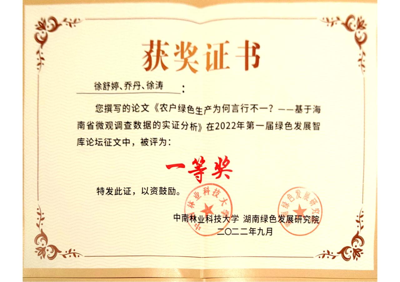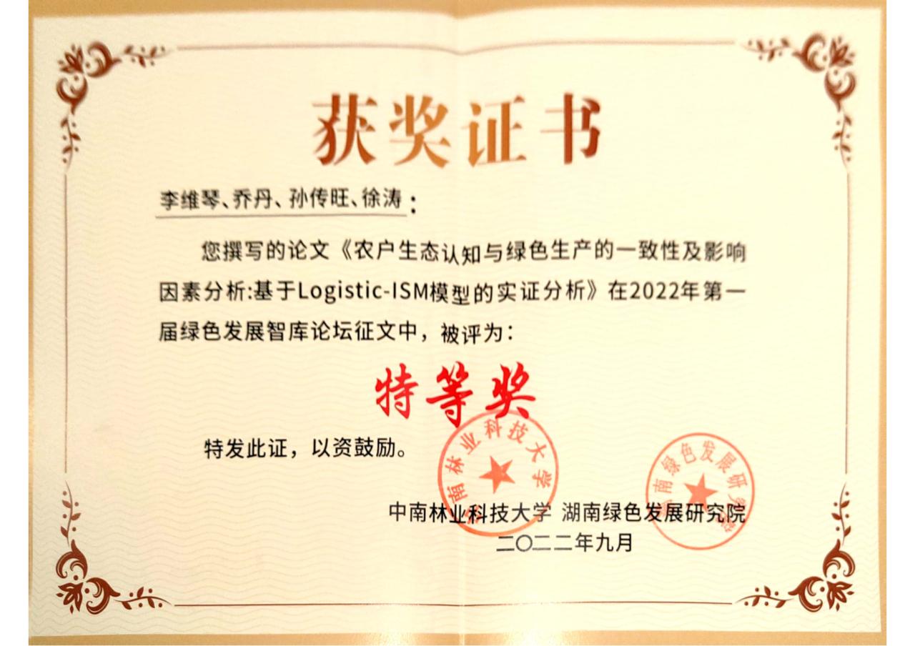 据悉,本届论坛以“乡村振兴与绿色发展”为主题,聚焦实施乡村振兴战略所面临的重大机遇与挑战,深入探寻乡村振兴与绿色发展的理论、路径与政策。论坛为期一天半,有来自中国人民大学、厦门大学、南京大学、华中农业大学、西北农林大学、东南大学、湖南大学、中国农业大学、兰州大学、山东大学、南京农业大学、东北农业大学、中央财经大学、湖南师范大学、浙江农林大学、安徽大学、海南大学、石河子大学、辽宁大学、西北大学、中央财经大学等90多家高校、研究机构的100余名专家学者参加。论坛共收到投稿论文255篇,经专家评审,评选出特等奖论文5篇,一等奖论文10篇。其中,由我院教师徐涛、孙传旺和乔丹共同指导的2021级农林经济管理专业硕士研究生李维琴撰写的《农户生态认知与绿色生产的一致性及影响因素分析:基于Logistic-ISM模型的实证分析》一文获得“特等奖”,李维琴受邀参加线下研讨会;由我院教师乔丹和徐涛共同指导的2020级农村发展专业硕士研究生徐舒婷撰写的《农户绿色生产为何言行不一?——基于海南省微观调查数据的实证分析》一文获得“一等奖”。