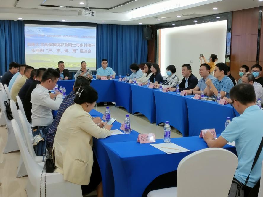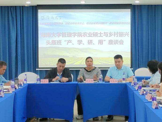 11月8日晚,管理学院农经系部分教师、农业硕士研究生与乡村振兴头雁班“产学研用”座谈会,在海南大学国际学术交流中心举行。海口市秀英区生态农业协会会长吴礼奋、海南人大代表符小芳等十余人,管理学院院副院长童泽林、系主任邓须军、系副主任徐涛等农经系教师代表出席座谈,部分在线农业硕士研究生参加。此次座谈是农经系40周年系列活动中的践行“把论文写在大地上,促进自贸港乡村振兴”院企联合系列研讨会的首场活动。