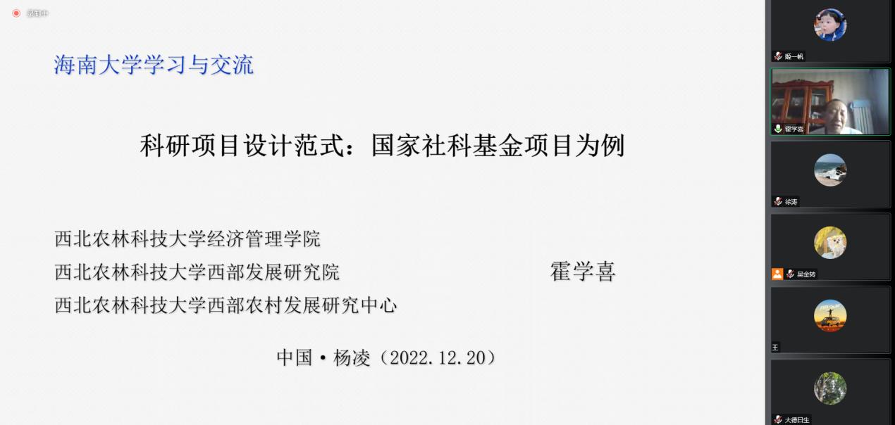 2022年12月20日下午,海南大学管理学院管理名家汇聚行动计划系列讲座第89期邀请西北农林科技大学西部发展研究院执行院长、西部农村发展研究中心主任霍学喜教授为我院师生作主题为“科研项目设计范式:国家社科基金项目为例”的讲座(线上视频形式)。讲座由赵达副院长主持,张德生副院长、许能锐副院长及管理学院师生50余人聆听了本次讲座。