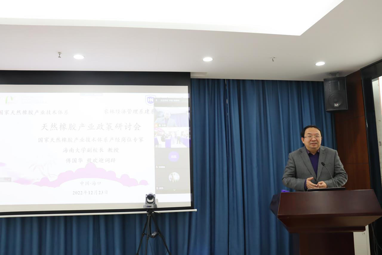 为进一步加强天然橡胶产业政策有关问题的交流研讨,完善天然橡胶产业政策,推进天然橡胶产业健康可持续发展,12月23日下午,天然橡胶产业技术体系产业经济岗位在海南大学组织召开“天然橡胶产业政策研讨会”。农业农村部农垦局热作处一级调研员林建明、中国天然橡胶协会常务副会长郑文荣、中国热带农业科学院橡胶研究所所长黄华孙、海南大学副校长傅国华、海南省发展改革委农经处副处长冯慧敏、海胶集团总经理助理王峰等来自政府主管部门、农垦企业、天然橡胶产业技术体系岗位专家、试验站站长以及从事天然橡胶领域研究的专家学者等参加会议。研讨会采用线上线下方式举行,由海南大学管理学院副院长许能锐教授主持。