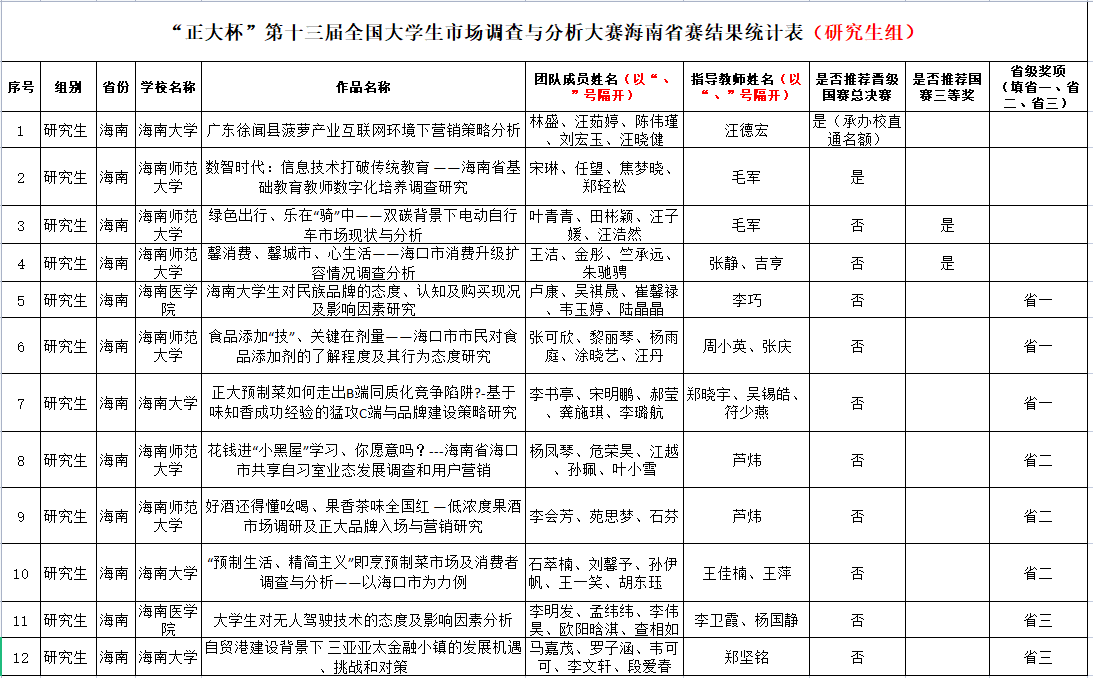 4月23日,“正大杯”第十三届全国大学生市场调查与分析大赛海南赛区研究生组省赛在海南大学管理学院举行。17支队伍经过报告初审的选拔,3支队伍晋级省赛答辩现场,最终角逐出2支参赛队伍晋级国赛。