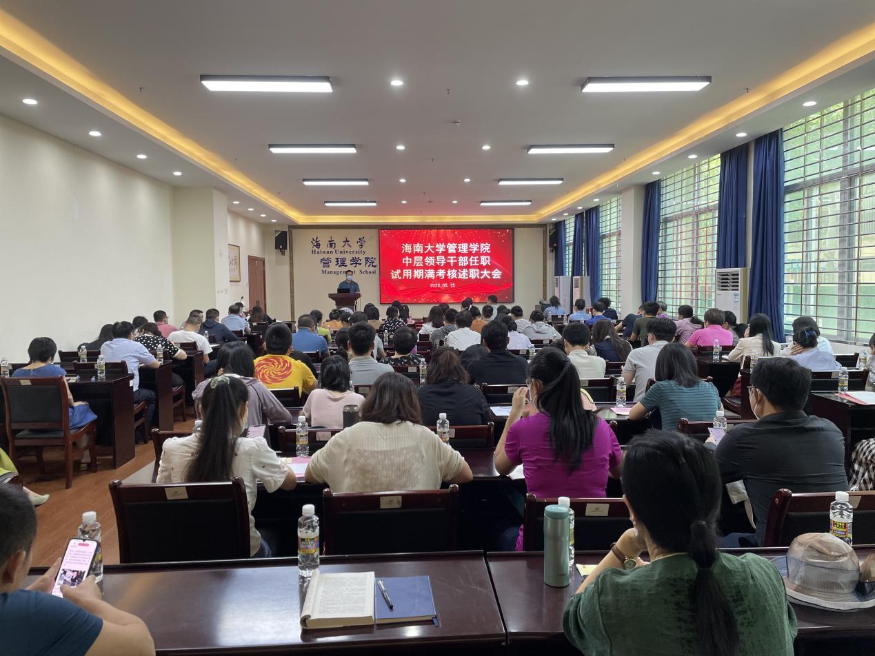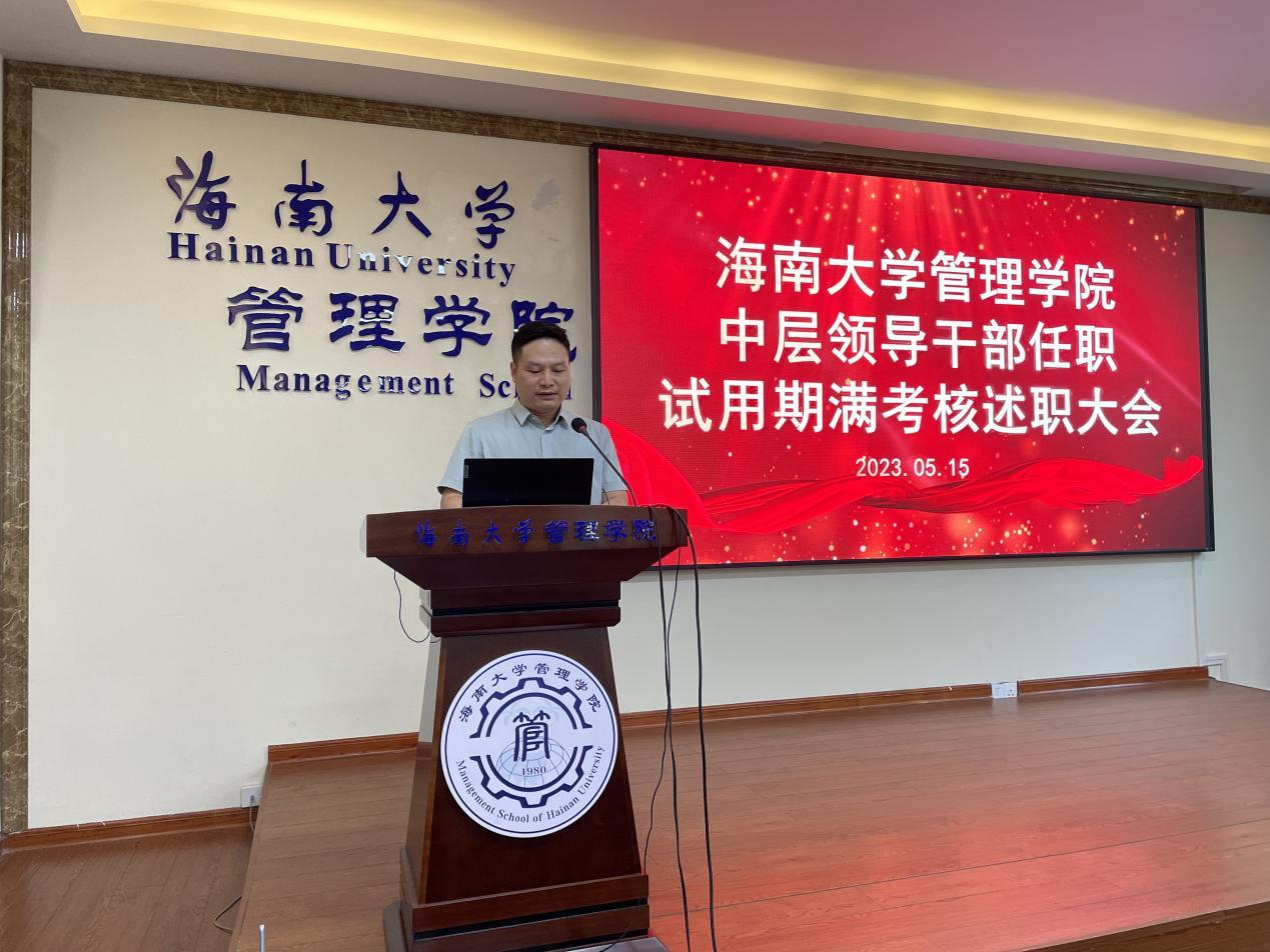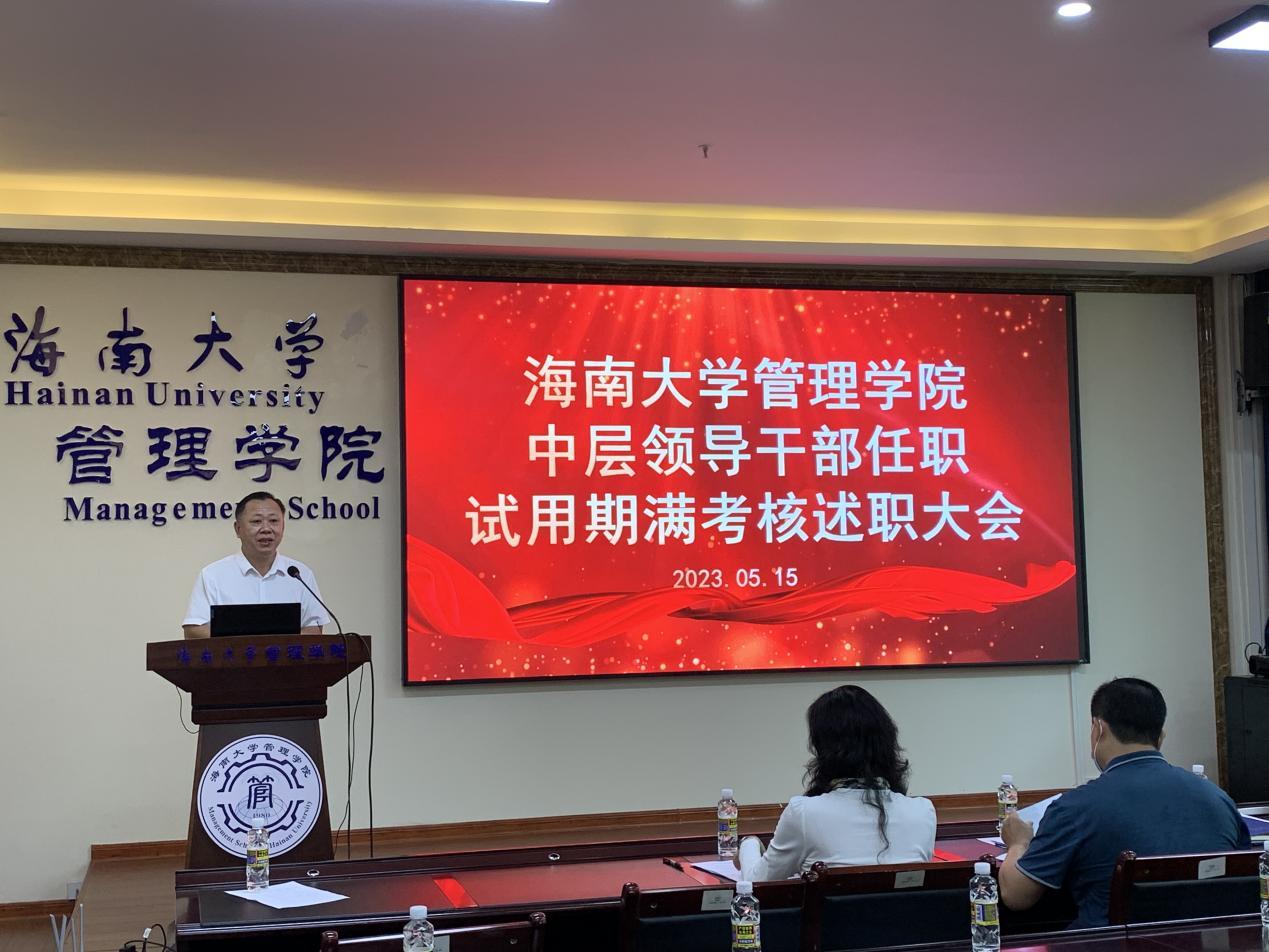 2023年5月15日下午,海南大学管理学院在社科楼B112学术报告厅召开中层领导干部任职试用期满考核述职大会。海南大学考核工作组组长邓井红、组员邢靖晨,管理学院院长唐宁玉、党委书记邢谷川、学院领导班子及全体教职工出席会议。学院党委书记邢谷川主持会议。