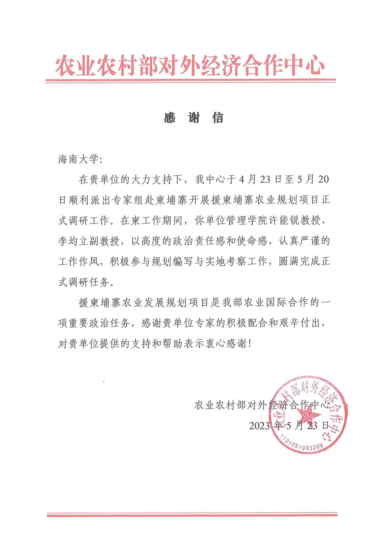 4月23日至5月20日,我院许能锐教授和李均立副教授应农业农村部对外经济合作中心邀请,赴柬埔寨开展援柬农业规划项目正式调研工作,主要负责柬埔寨天然橡胶产业发展规划编写与实地考察。在柬工作期间,许能锐教授和李均立副教授并以高度的政治责任感和使命感,认真严谨的工作作风,圆满完成任务,并获得农业农村部对外经济合作中心的感谢信。