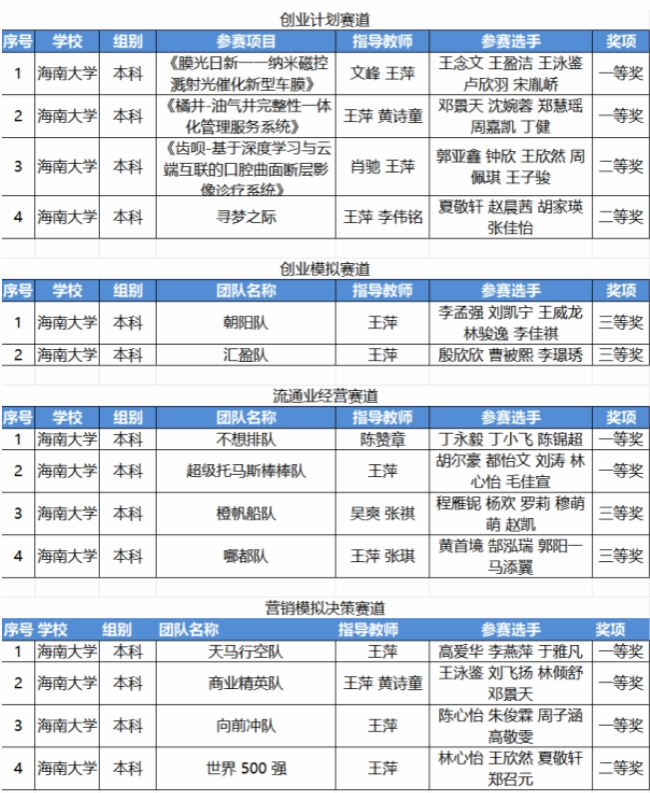 竞赛分为创业计划、创业模拟,流通业经营模拟、营销模拟决策四个赛道。其中,创业计划赛道获国家级一等奖2项,国家级二等奖2项;创业模拟赛道获国家级三等奖2项;流通业经营赛道获得国家级一等奖2项,三等奖2项;营销模拟决策赛道获得国家级一等奖3项,二等奖1项。