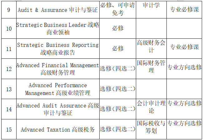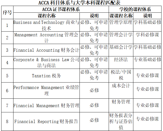 成绩转换说明:按照ACCA官方的规定,学生申请ACCA免考课程(6门)后就不能再参加官方考试,为了让免考课程与非免考课程享有一样的转换通道,免考课程由学校按官方命题难度组织期末考试,考试卷面成绩乘1.2系数转换后(ACCA官方成绩50分及格,学校60分及格),再按学校成绩认定规则(卷面成绩60%+平时成绩40%)确定总评成绩。免考课程以外的其他ACCA课程若与学校培养方案中有匹配课程,其官方考试成绩同样乘上1.2系数转换后,再按学校成绩认定规则确定总评成绩。