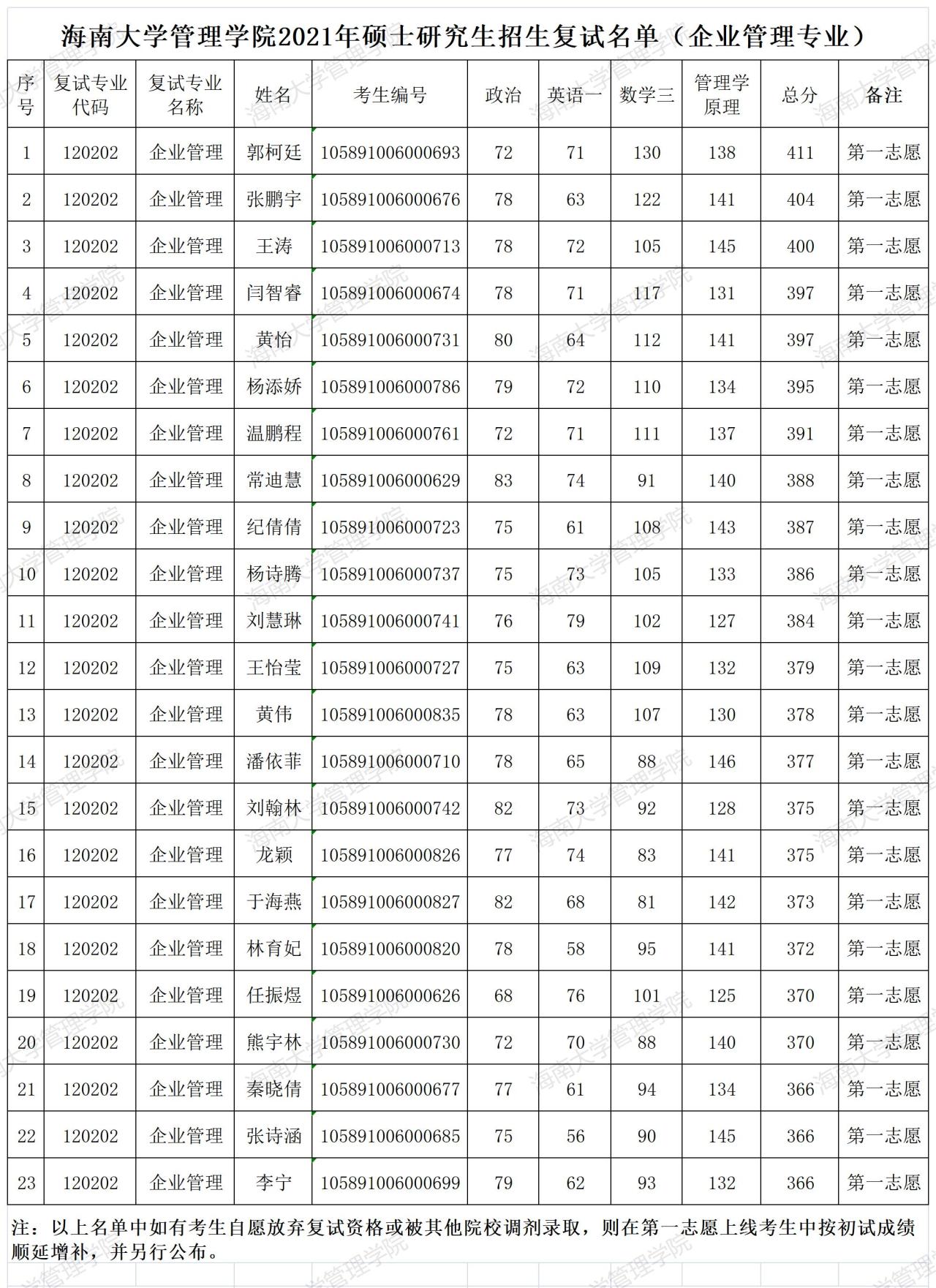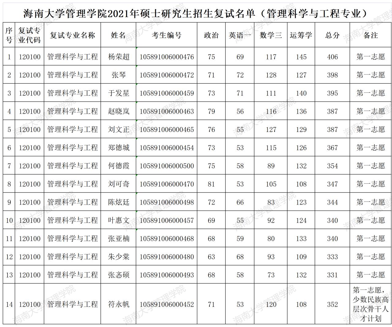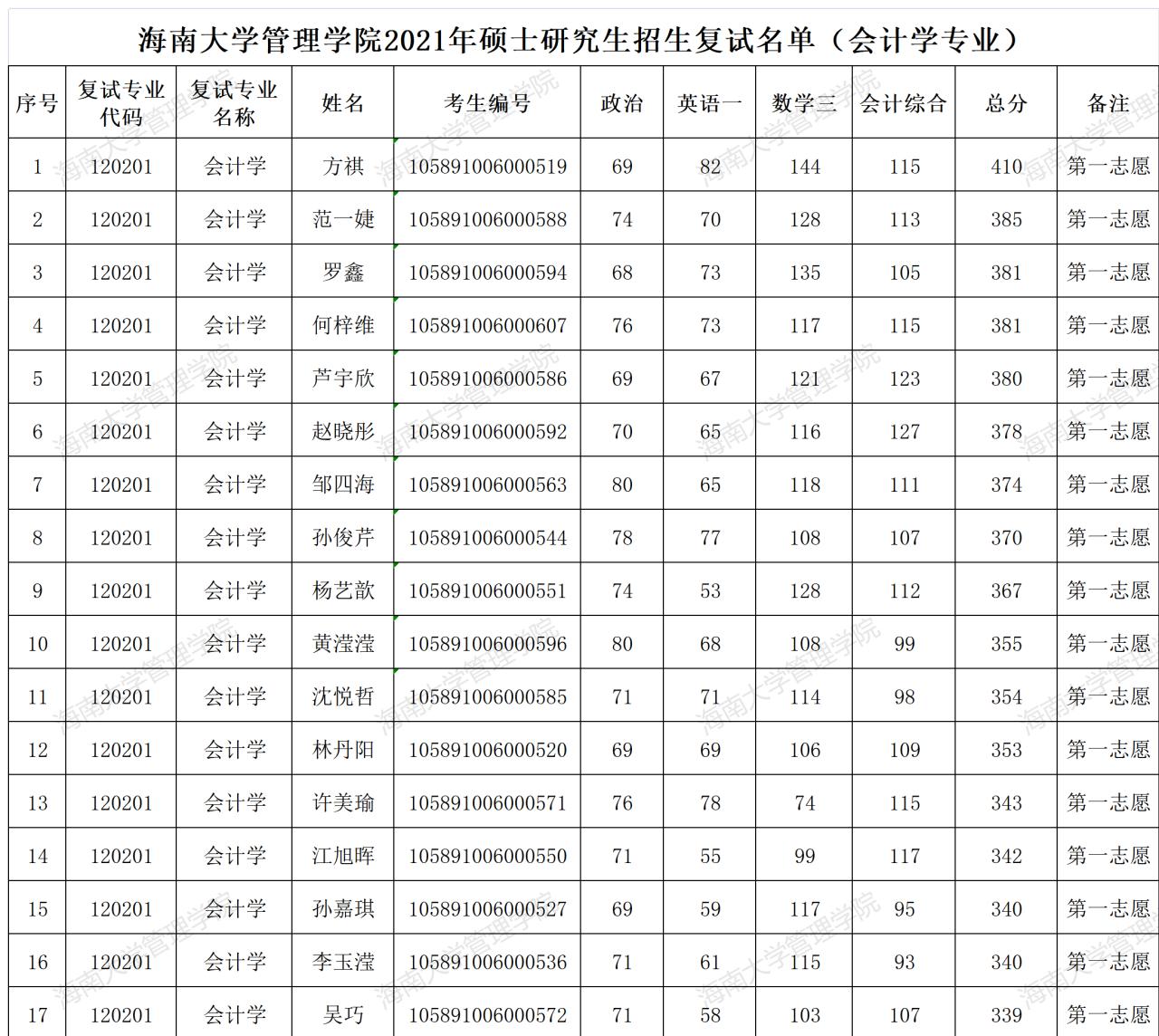 根据《海南大学管理学院2021年硕士研究生招生复试录取工作办法》,会计学专业复试比例为120%,复试人数17人;管理科学与工程专业复试比例为120%,复试人数14人(含1名专项计划);企业管理专业复试比例为120%,复试人数23人。如遇考生自愿放弃复试资格或被其他院校提前调剂录取,则在第一志愿上线考生中按初试成绩顺延增补,并另行公布。