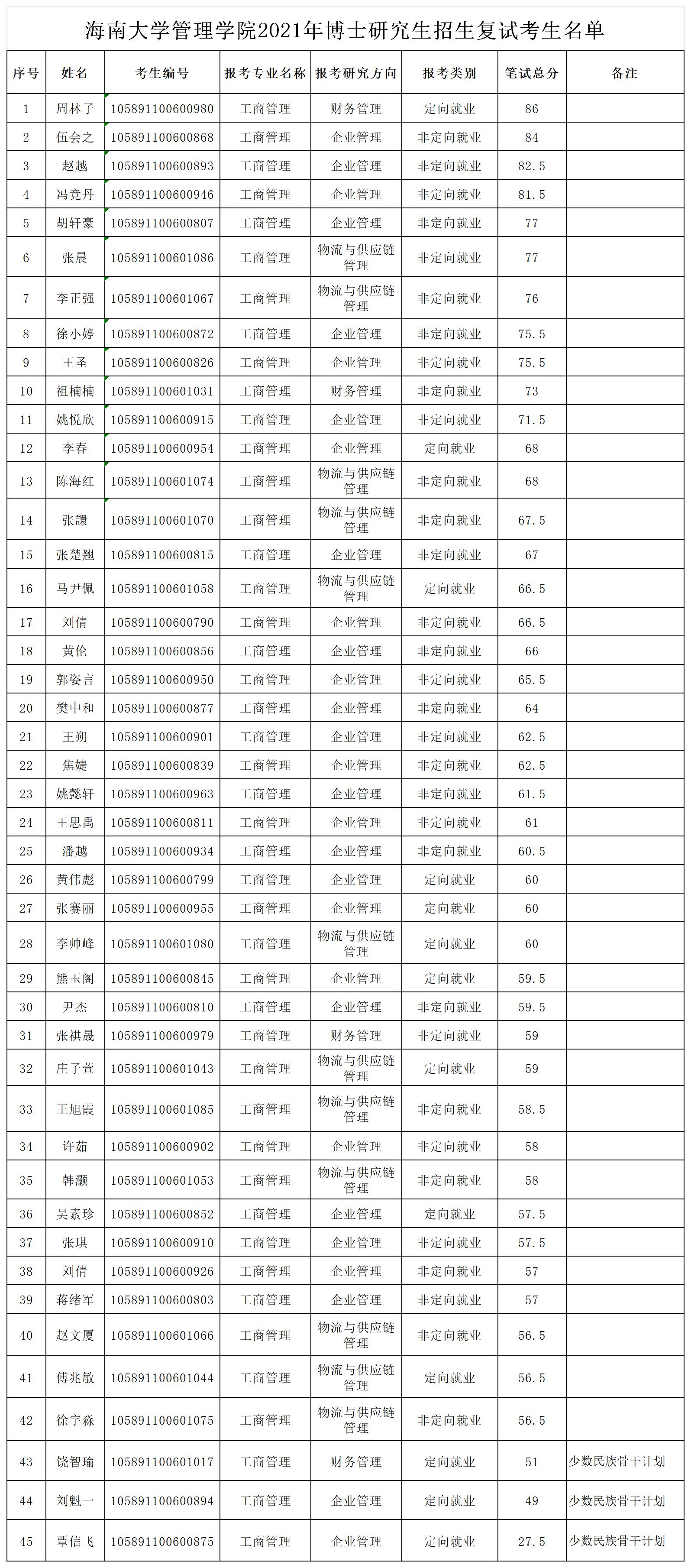 海南大学管理学院2021年博士研究生招生复试考生名单
