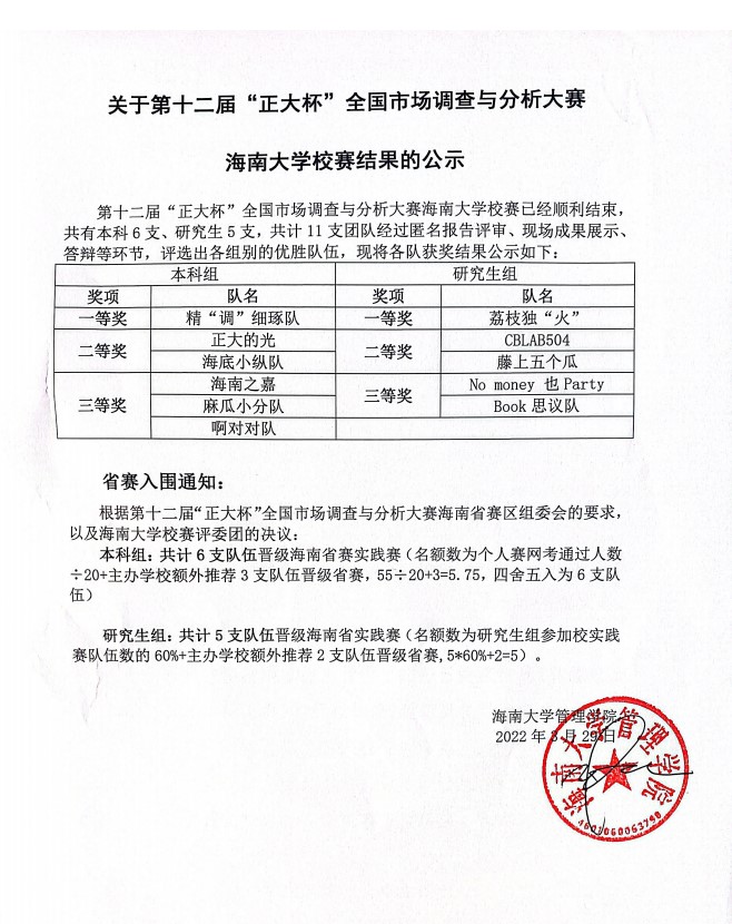 关于第十二届“正大杯”全国市场调查与分析大赛海南大学校赛结果的公示