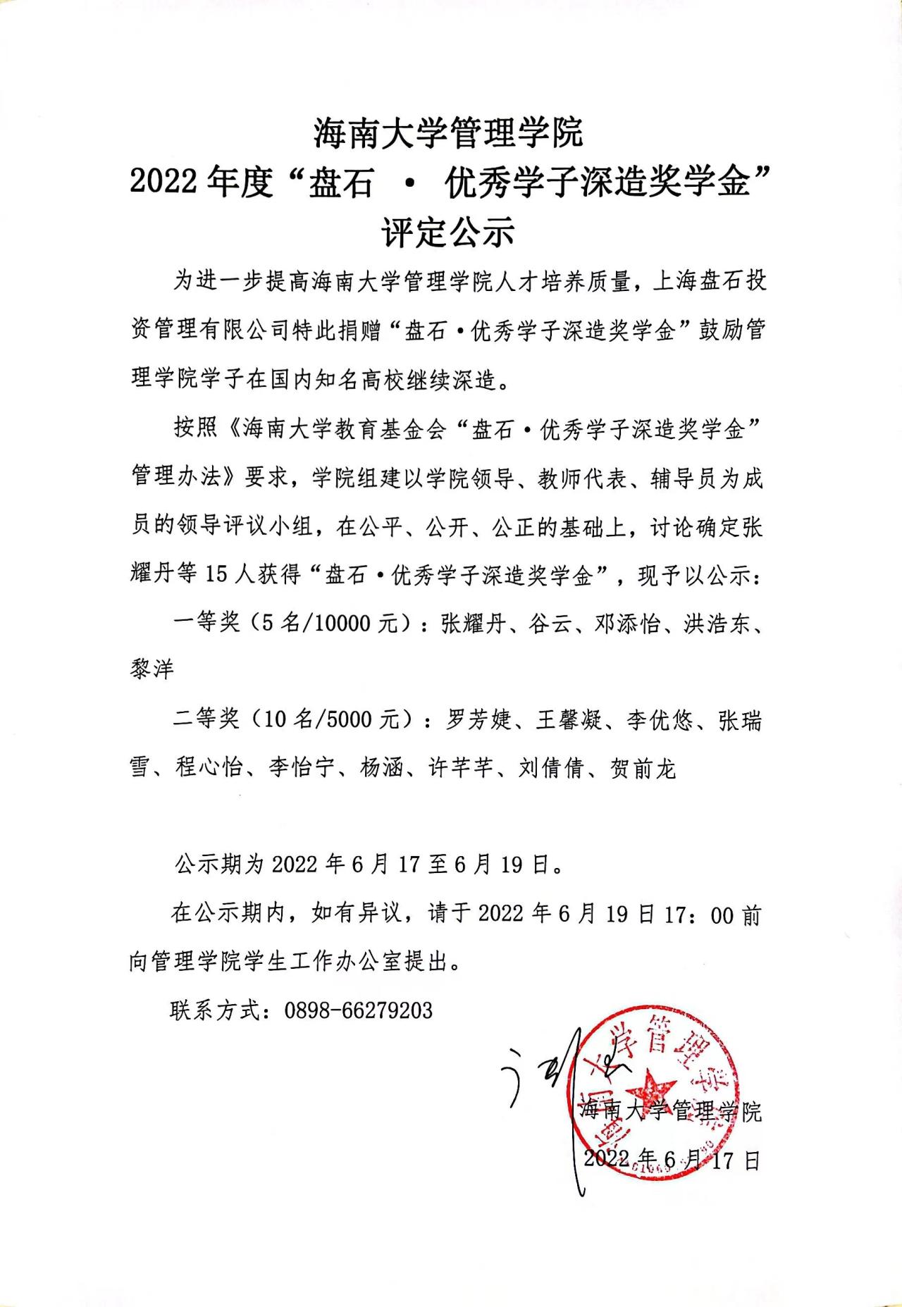 海南大学管理学院2022年度“盘石·优秀学子深造奖学金”评定公示