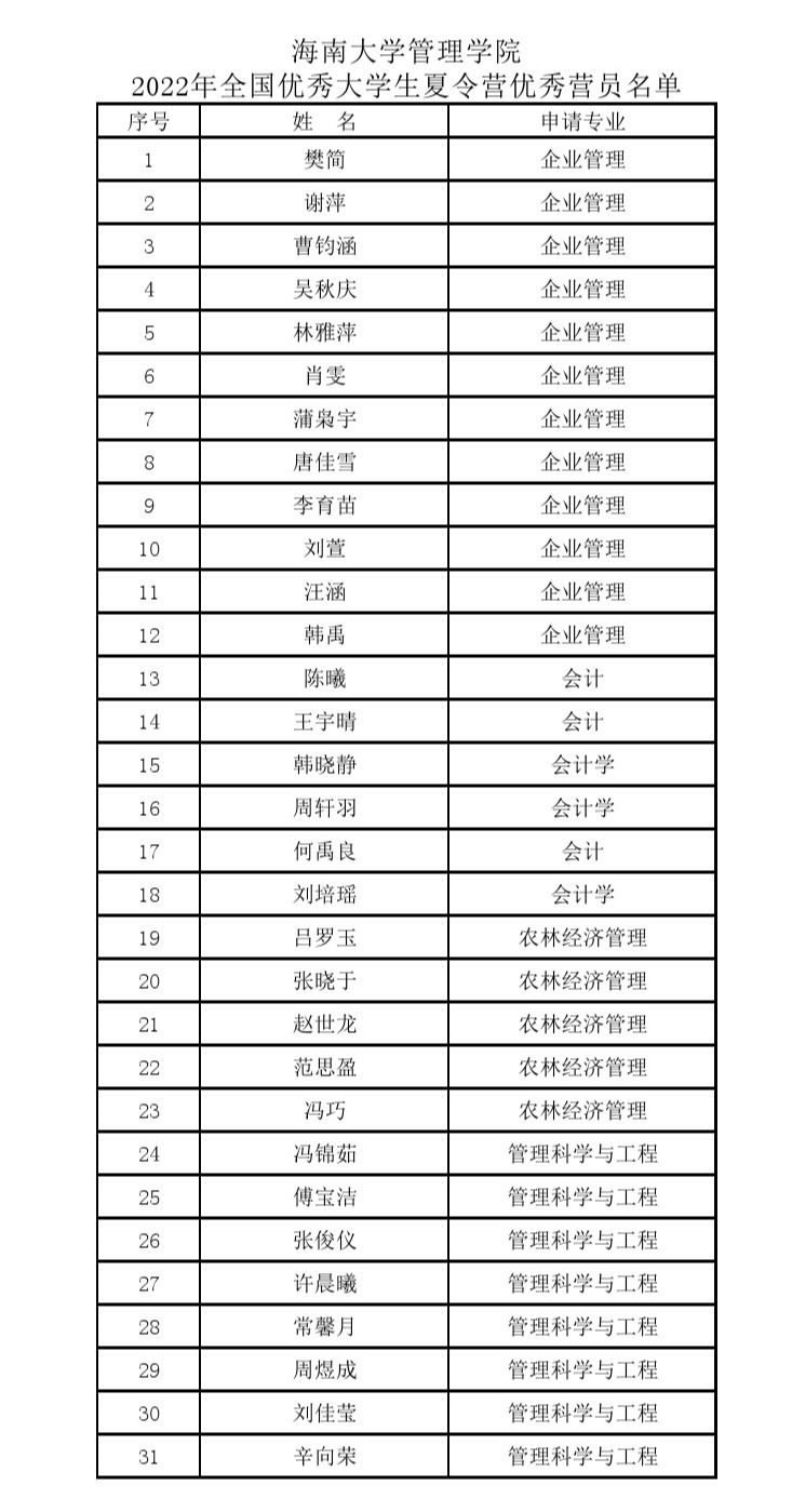 海南大学管理学院2022年全国优秀大学生夏令营“优秀营员”名单