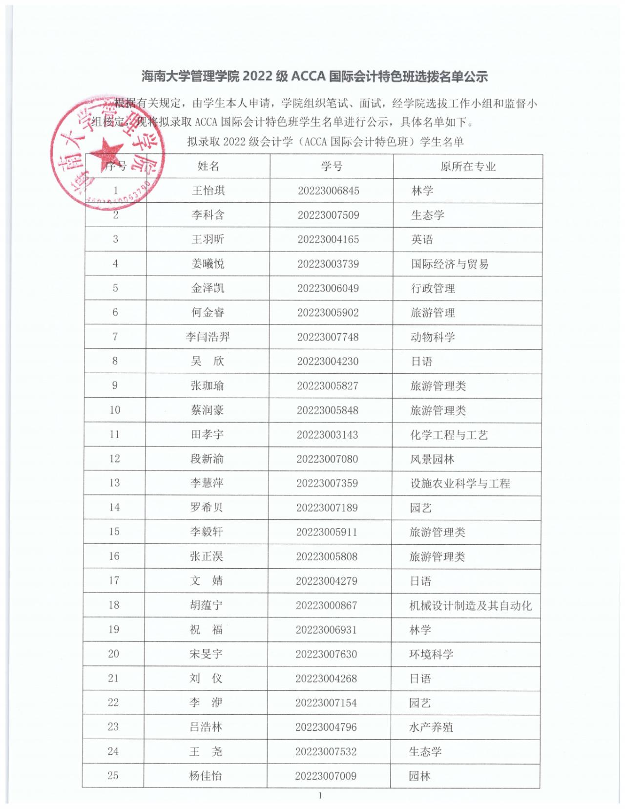 海南大学管理学院2022级ACCA国际会计特色班选拔名单公示