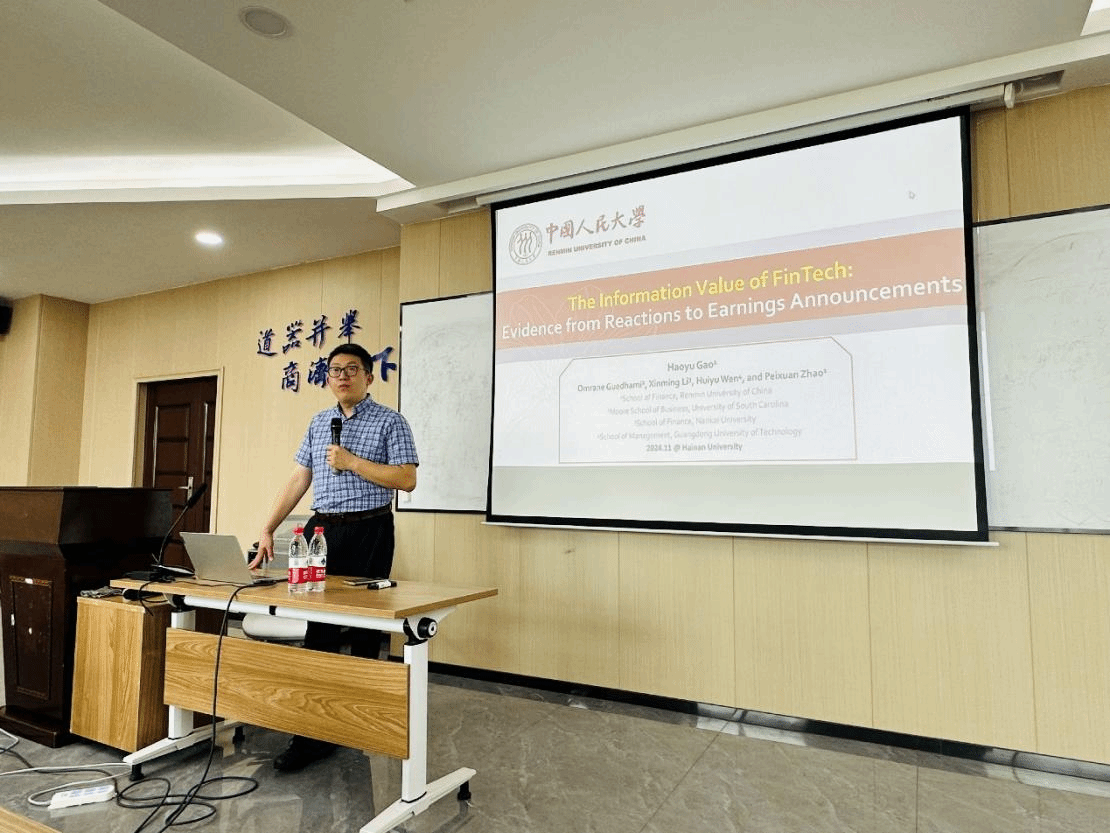 11月5日下午,高昊宇教授在海南大学海甸校区社科楼B623室,做了题为“The Information Value of FinTech: Evidence from Reactions to Earnings Announcements”的学术讲座。本次讲座由金融系主任刘志峰教授主持,吸引了金融学专业本科生及相关老师和学生的广泛参与。