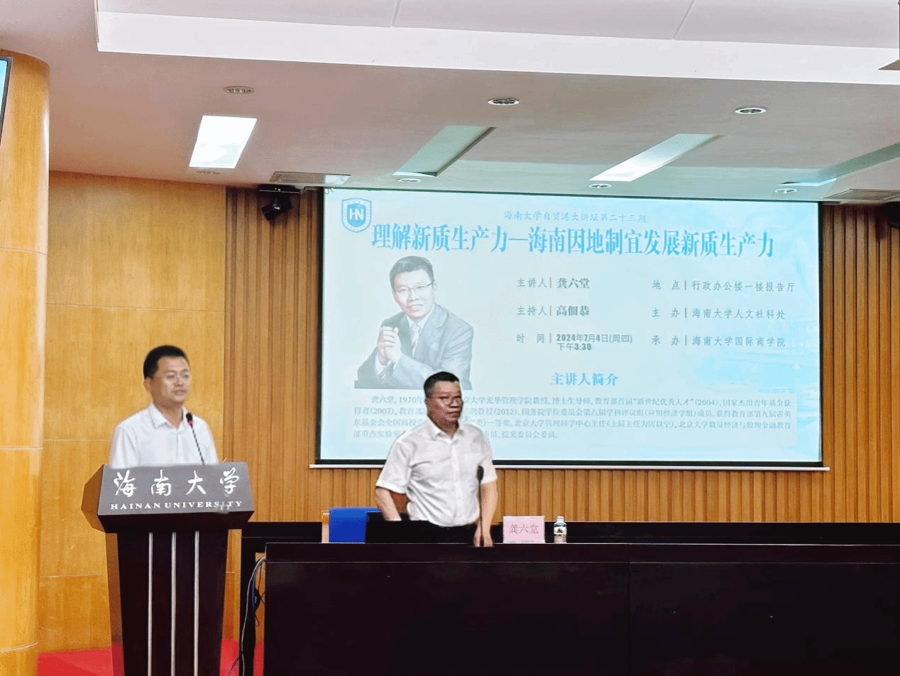 2024年7月4日下午3点30分,国务院应用经济学学科评议组成员、北京大学光华管理学院教授龚六堂以《理解新质生产力—海南因地制宜发展新质生产力》为题,为师生们解读了新质生产力的发展。本次讲座由海南大学人文社科处主办,国际商学院承办。海南大学副校长高佃恭主持讲坛。