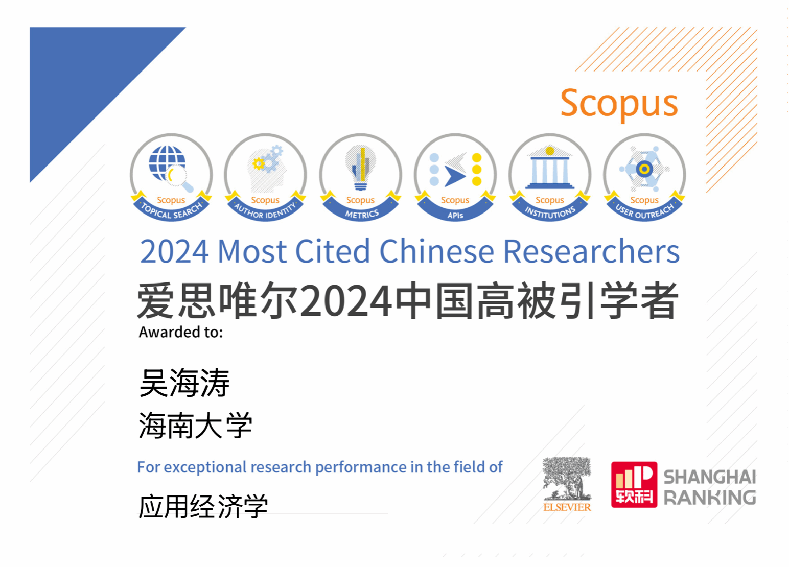 近日,爱思唯尔(Elsevier) 正式发布了2024“中国高被引学者” (Highly Cited Chinese Researchers)榜单。本次上榜共计6388人, 来自547所高校、企业及科研机构,覆盖了10个教育部学科领域中的83门一级学科。我院教师吴海涛、Jahanger Atif(阿提夫)入选“中国高被引学者” 应用经济学学科榜单,彰显伟德bv1946官网科研实力与学术影响力的持续提升,实现伟德bv1946官网学科建设和高水平人才队伍建设的新突破。